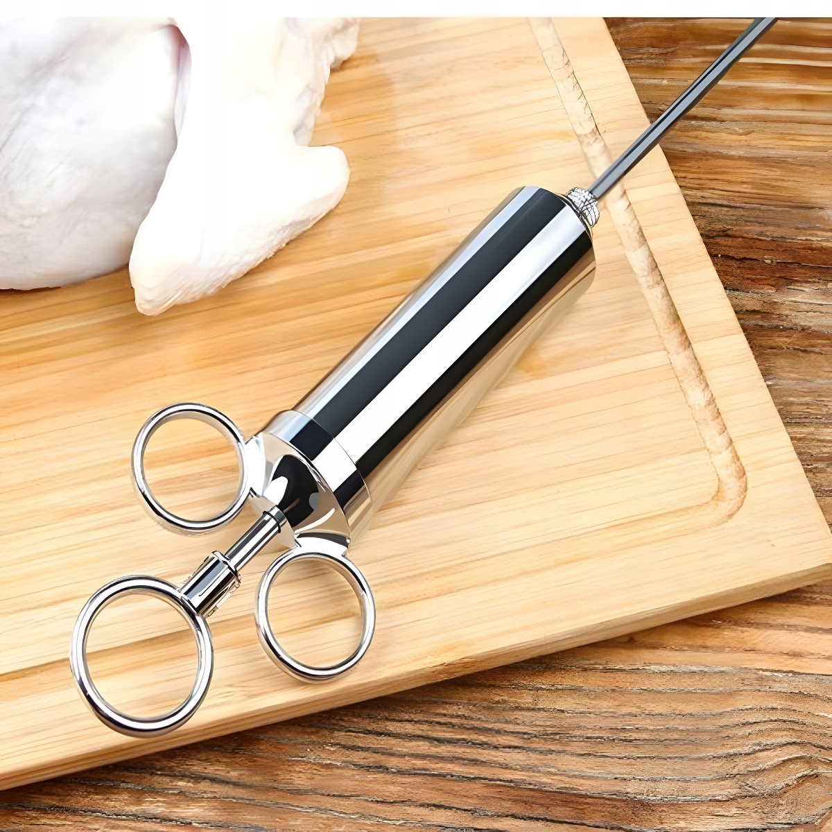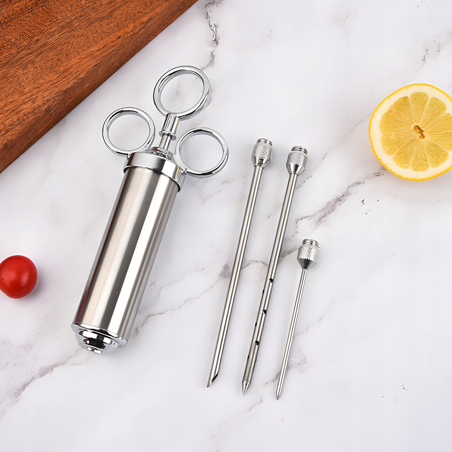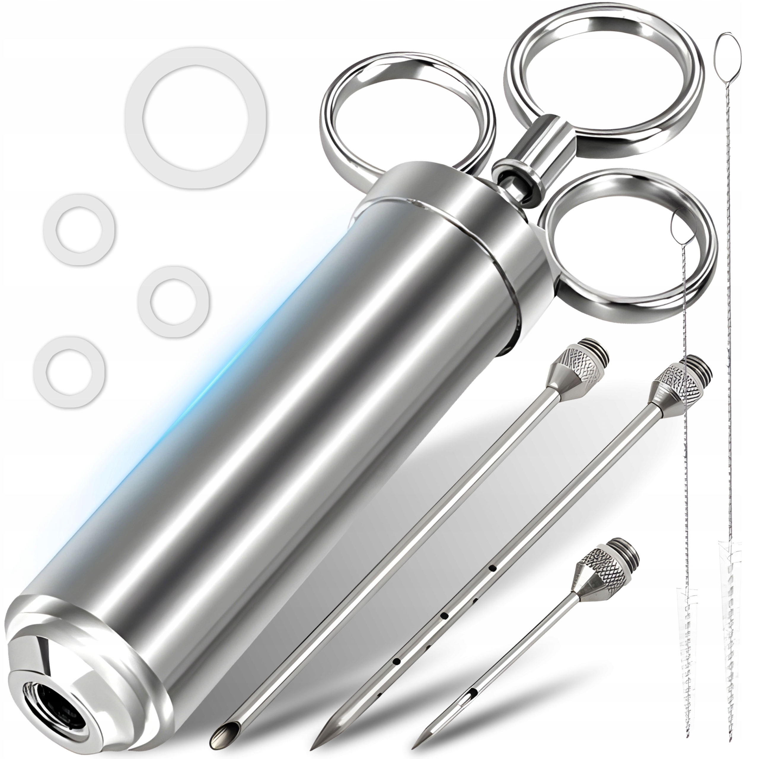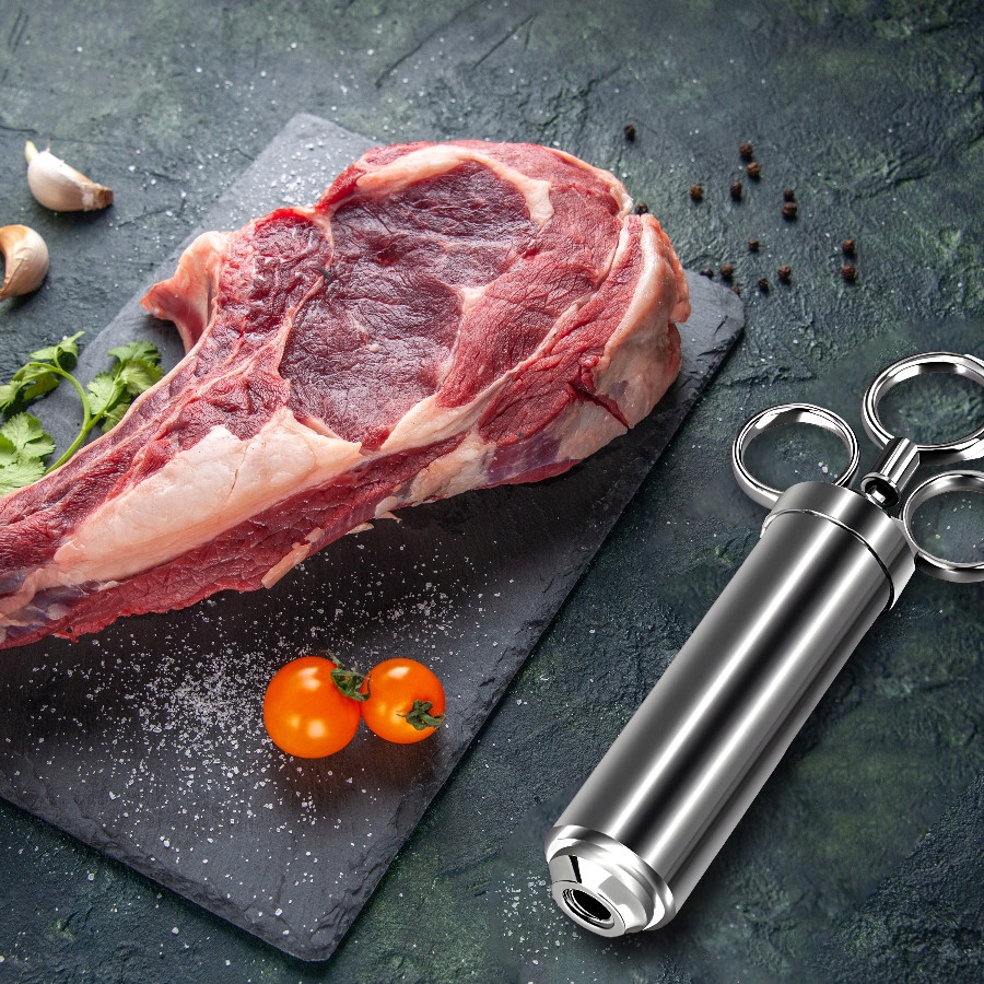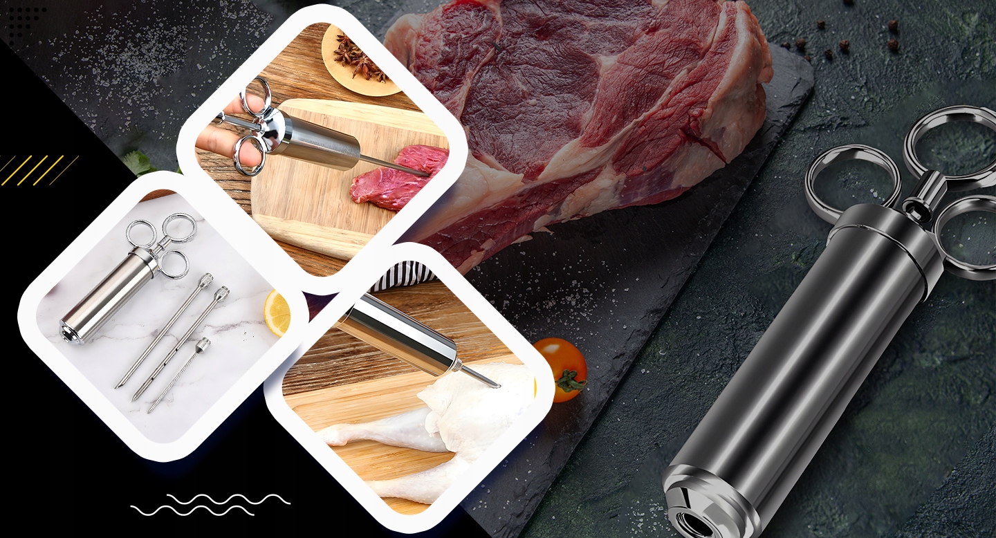 - Игла с широкими выходами - идеально подходит для введения маринадов, содержащих большие кусочки специй, обеспечивая им легкую и эффективную дозировку. Игла - создан для точной работы с меньшими кусками мяса или рыбы, где требуются деликатеса и точность.