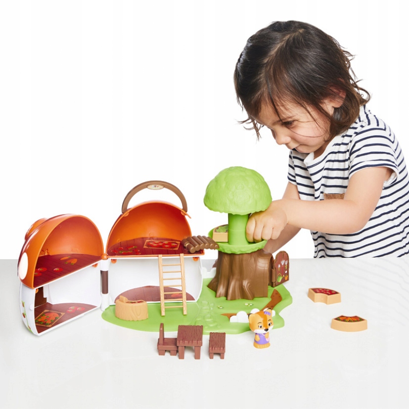 В комплект входят: Домик-поганка, одно животное, лестница, 4 коробки со сборами, стойка, стул, скамейка, стол. Для сборки игрушки необходим взрослый.