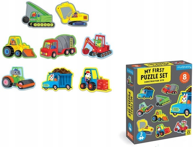 Первый пазл «Стройка» от американского бренда MUDPUPPY — это набор из 8 пазлов для детей от 2 лет. Все они имеют по 2 элемента, поэтому дети легко и быстро привыкнут к такой форме игры. Размер каждой картинки-транспорта примерно 10х15 см, что удобно для малыша. В комплект входят: вилочный погрузчик, самосвал, каток, два гусеничных экскаватора, бетономешалка, бульдозер и машина с шаром-разрушителем. Сложенные транспортные средства можно использовать, чтобы рассказать истории о последующих этапах процесса строительства. Красивые цвета и милые животные, управляющие этими машинками, побуждают к игре.