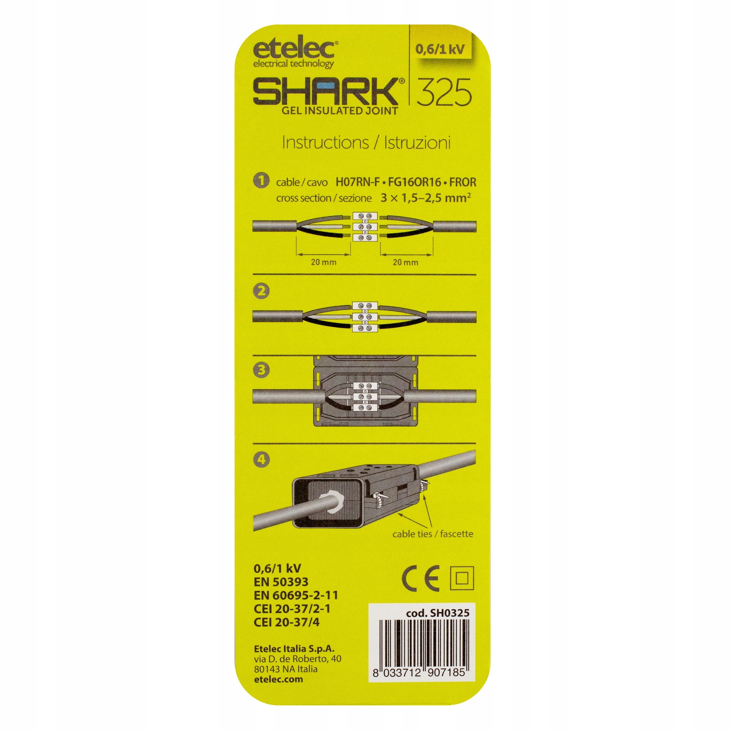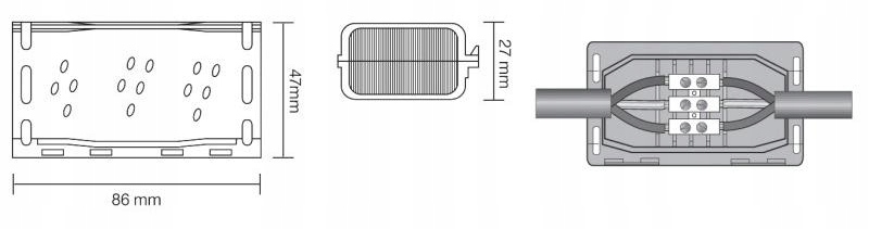 Соединитель используется для соединения одно- и многополюсных наружных кабелей с сечением 0,5 - 2,5 мм² (например, для YKY 3x1,5 3x2,5). Его можно использовать как для одножильных кабелей (провод), так и для многожильных кабелей (многожильный). Изоляцию фаз обеспечивает специальный сепаратор, входящий в комплект. Максимальное напряжение составляет: 0,6/1 кВ.