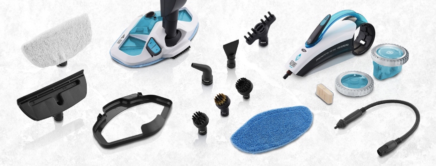 Гибкий удлинительный шланг 85 см; плоская мини-шайба; изогнутая паровая насадка; щетка для очистки затирки; нейлоновая щетка; большая круглая кисть; латунная щетка; широкий омыватель окон и зеркал; насадка для швабры со встроенным резервуаром и щеткой; чехол из микрофибры; насадка для чистки ковров; сменная ручка с держателем для крепления кабеля питания.
