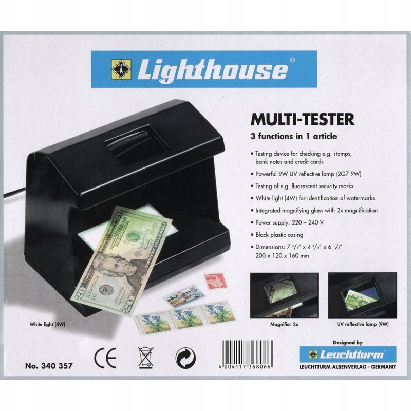 Благодаря этому устройству вы можете проверять марки, банкноты, монеты, кредитные карты, а также, например, флуоресцентные защитные элементы банкнот, чтобы отличить оригинал от подделки. Мультитестер оснащен эффективной лампой UV-9W (2G7 9W), благодаря которой цветные частицы, активные в ультрафиолетовом свете, становятся видимыми даже при дневном свете. Благодаря лампе, помещенной в основание мультитестера (молочный свет снизу - лампа мощностью 4 Вт), можно распознать водяной знак, а благодаря встроенной лупе - рассмотреть объект с 2-кратным увеличением. .