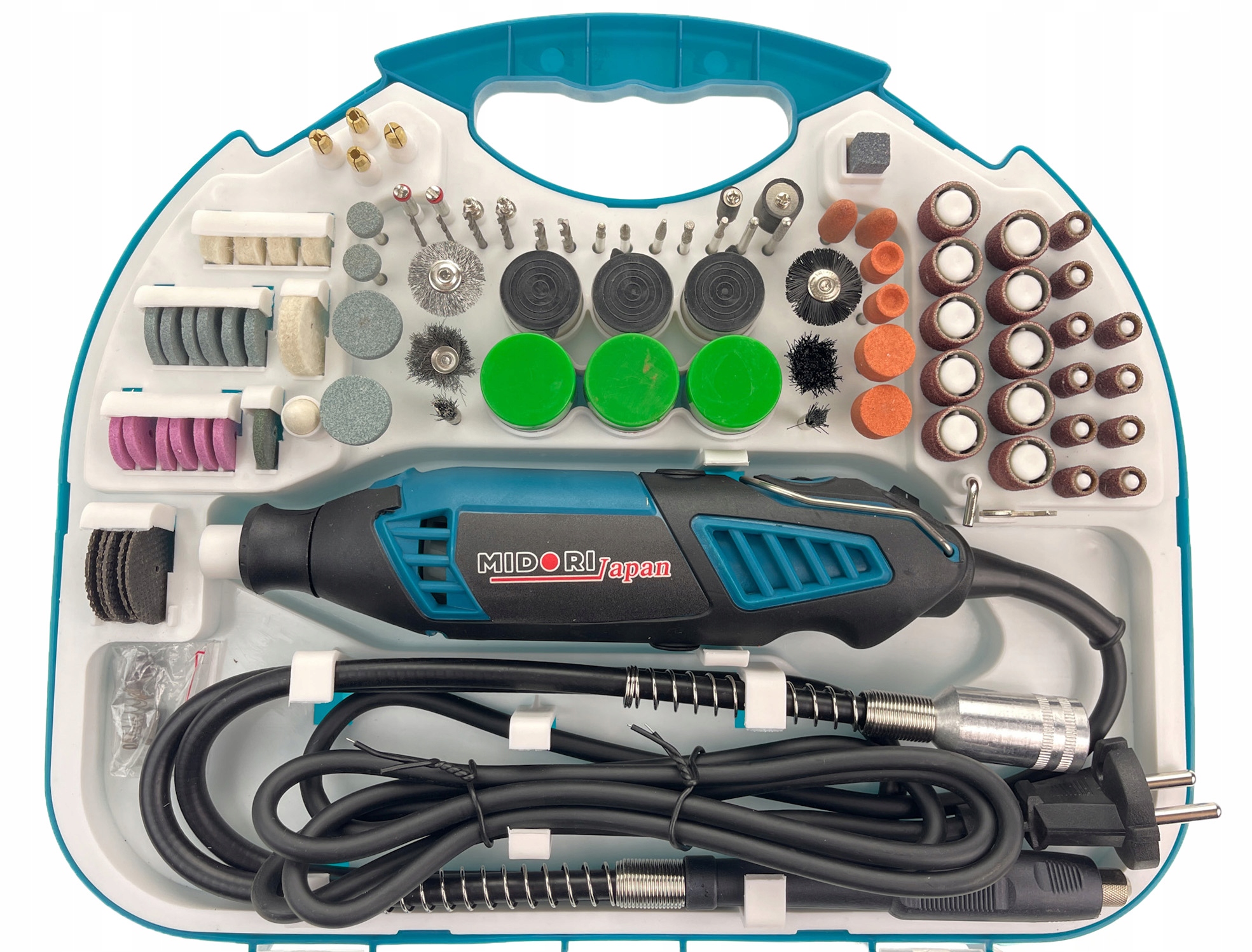 Контейнер вмещает бесчисленное количество аксессуаров, таких как алмазные шлифовальные палочки и шлифовальные камни, абразив диски и отрезные диски, а также щетки для чистки, абразивные головки, полировальные диски и сверла.