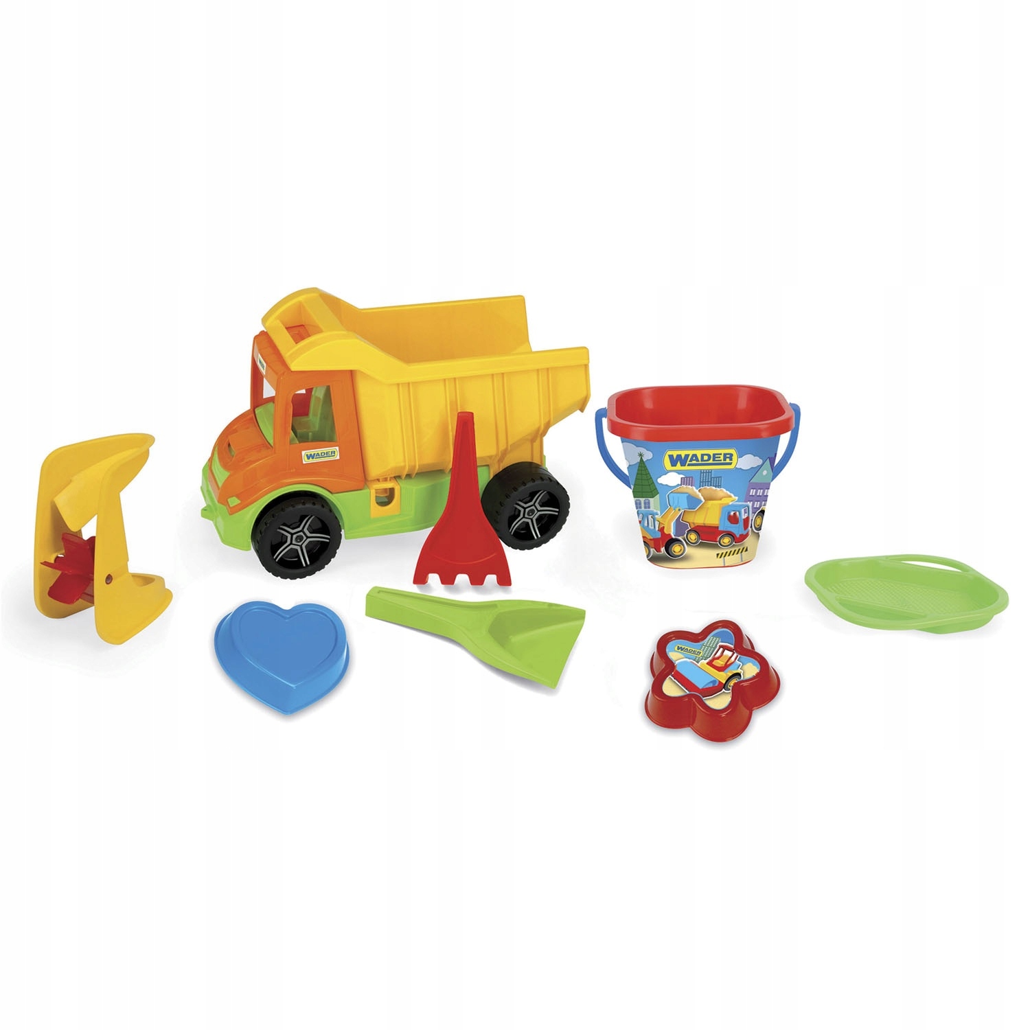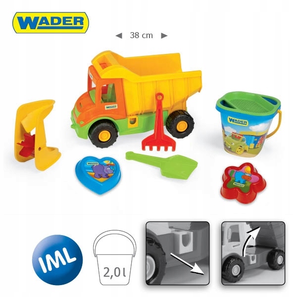 38 см из типа от серии Multi Truck, в сете с летним набором, который состоит из ведра с ситом, лопасти, объятия, песчаную шлифовальную машину и две формы. Автомобиль имеет погрузочную коробку. Вы можете транспортировать песок, гальку или другие летние игрушки