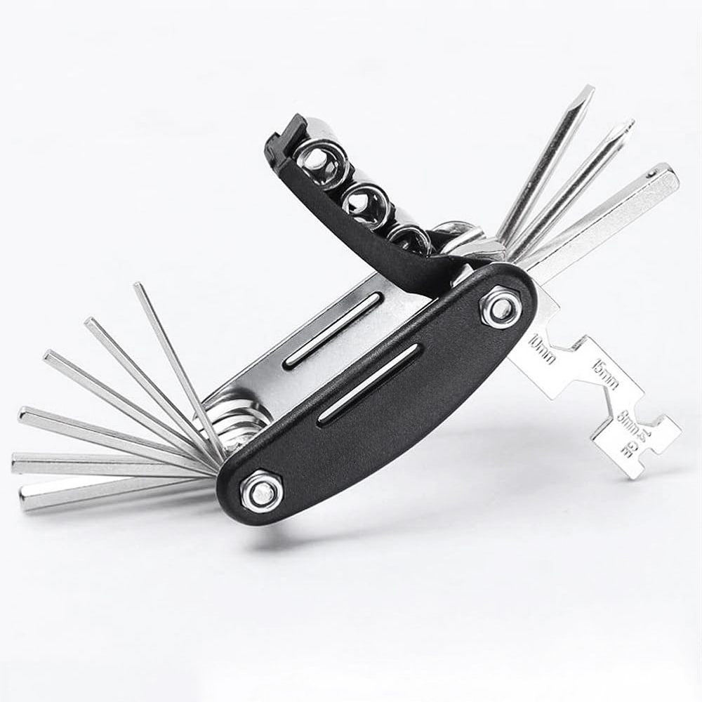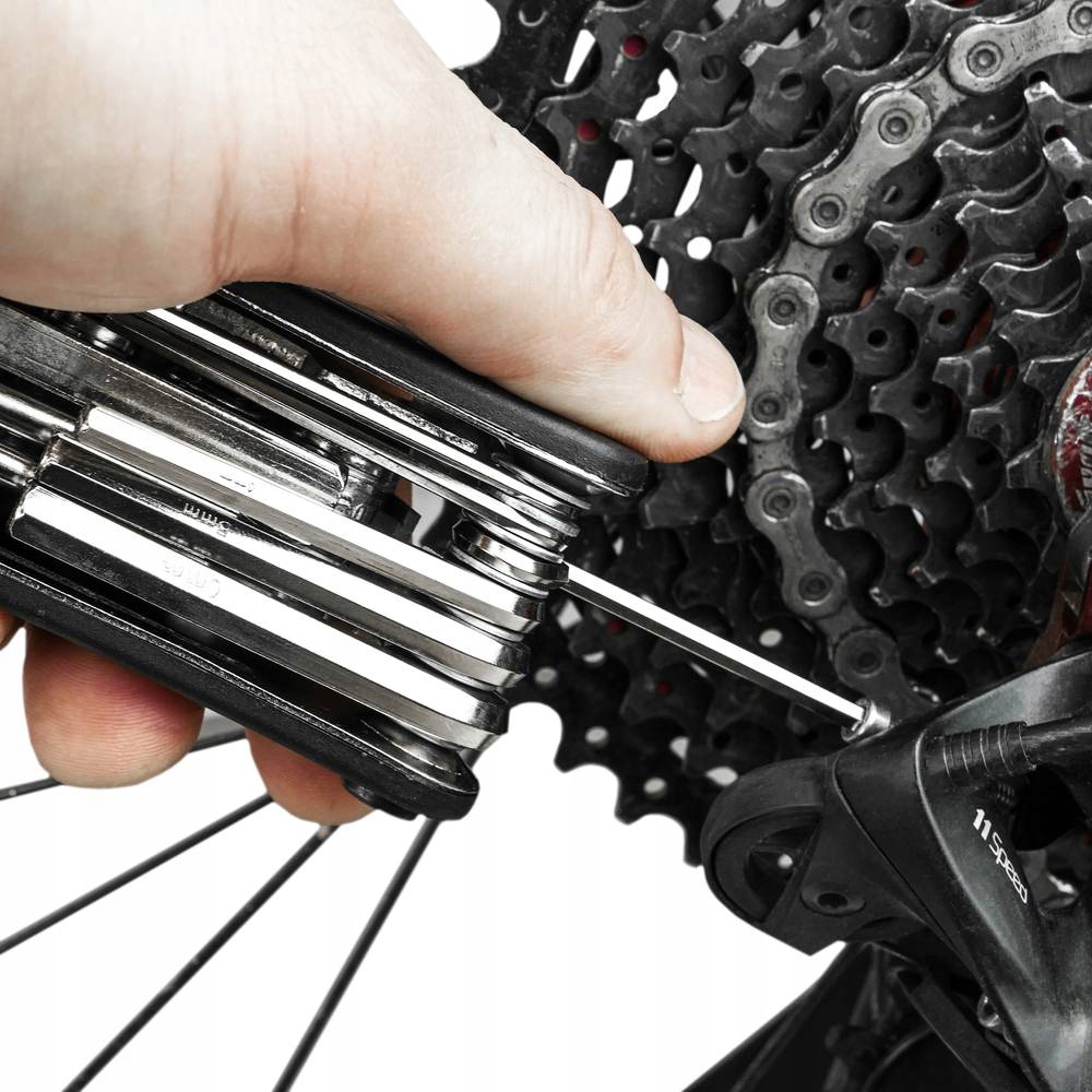 В набор входит 16 функций, включая шесть различных шестигранных ключей, две отвертки, три торцевые головки и спицевой ключ. Этот универсальный инструмент позволяет выполнить быстрый ремонт в любой ситуации, независимо от типа велосипеда.