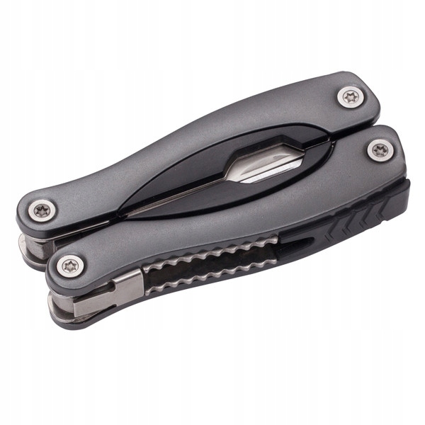 Инструмент с 9 функциями в алюминиевом корпусе, карманный вариант инструмента Feat.Лезвия из нержавеющей стали. Упакован в чехол из полиэстера. В состав инструмента входят: нож, крестовая отвертка PH, открывалка для бутылок, плоская отвертка среднего размера, зубчатый нож, комбинированные плоскогубцы с ножницами для резки проволоки, небольшая плоская отвертка, консервный нож, однорядный напильник и двойной одинарный напильник. файл строки.