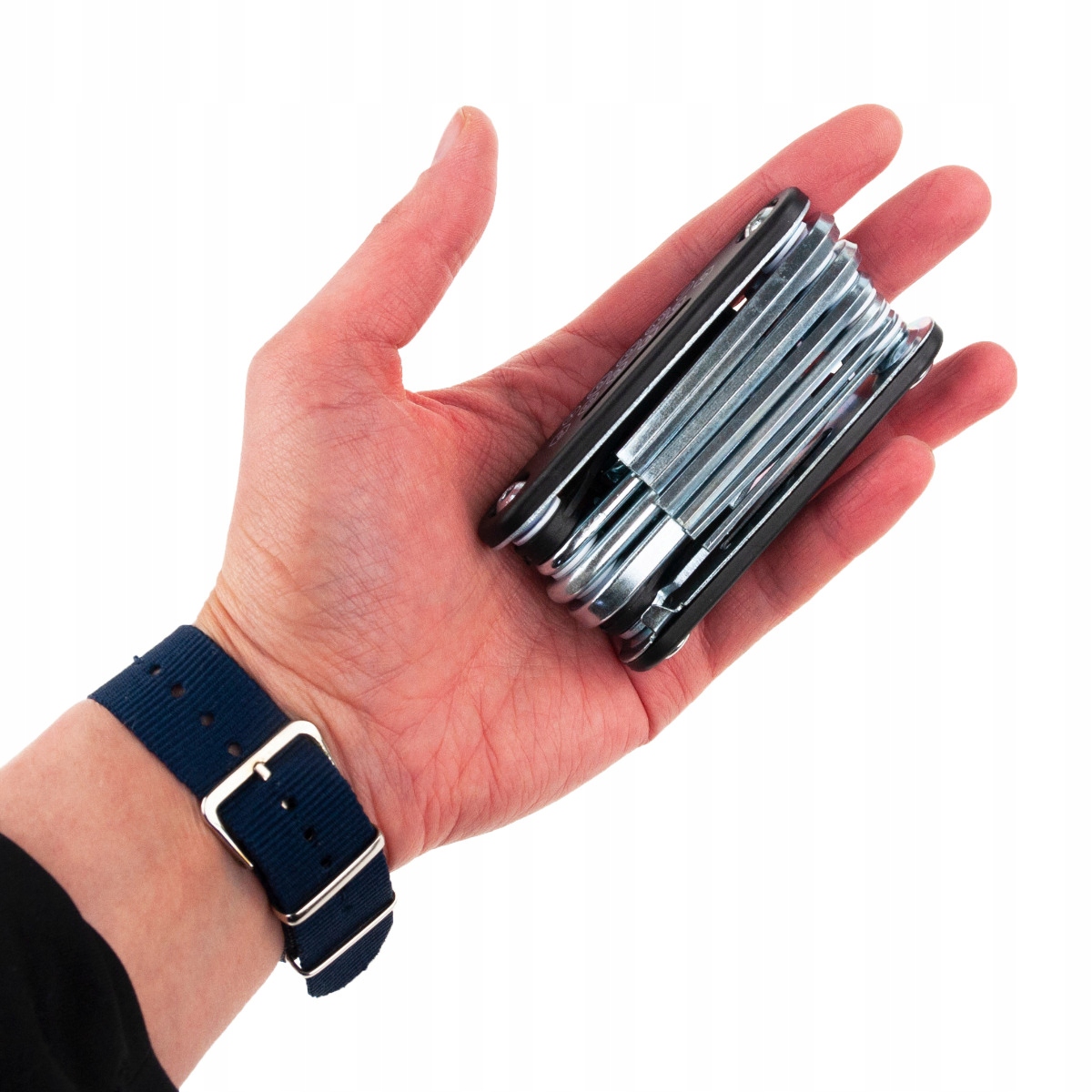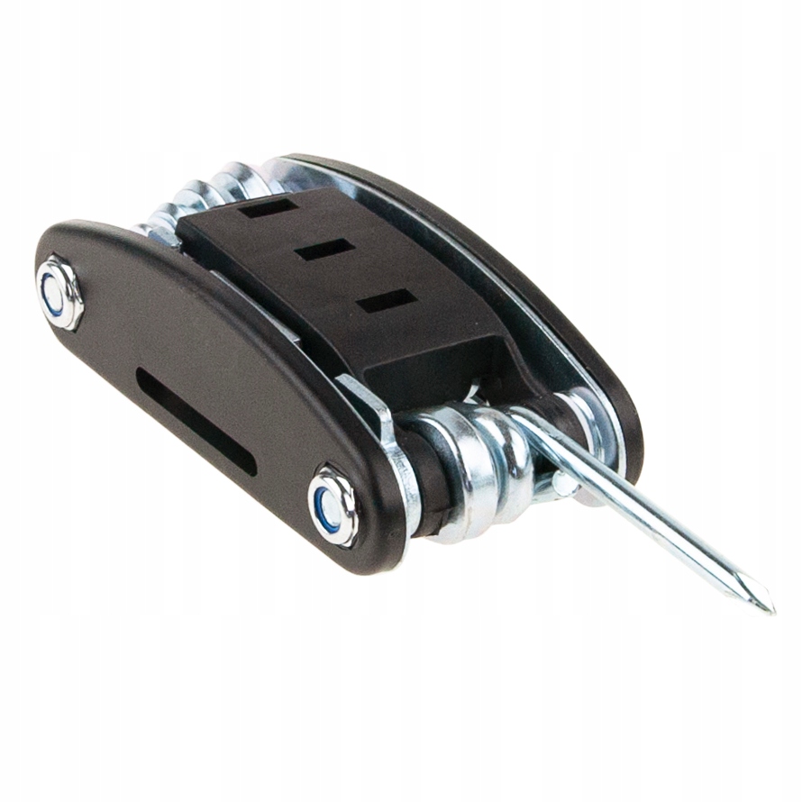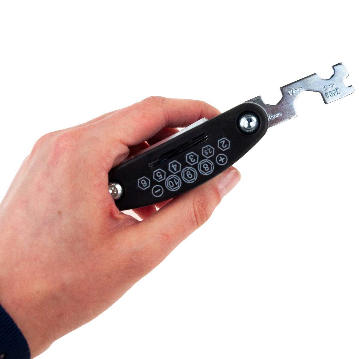 В наборе 16 важнейших инструментов для регулировки велосипеда. Все это было заключено в компактную форму карманного ножа. В сложенном виде он помещается в руке и его легко хранить, например, в кармане или велосипедной сумке. В комплект входят: шестигранные ключи, отвертки, торцевые головки с переходником, а также рожковые ключи и специальный спицевой ключ.