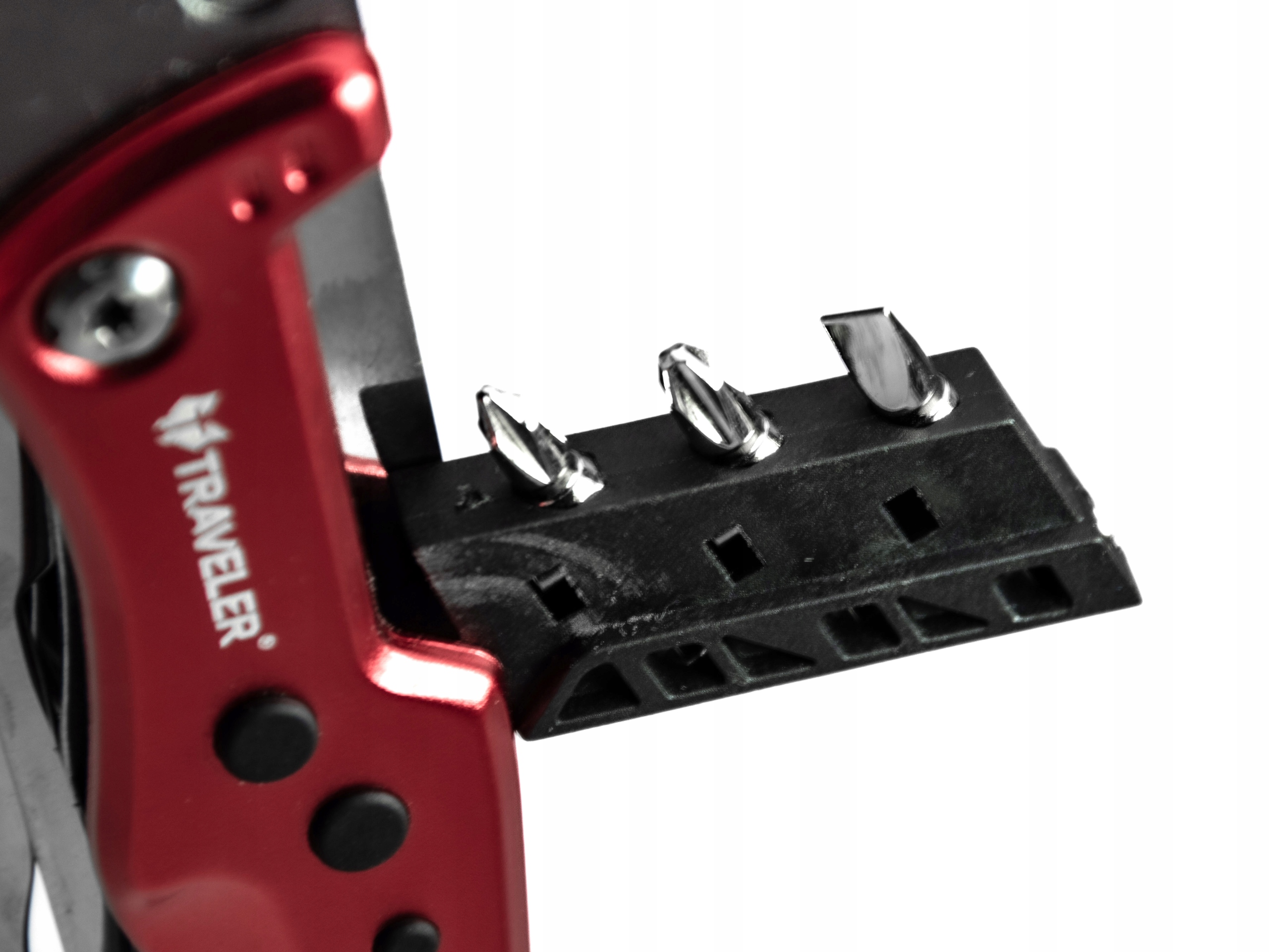 - В состав мультитула входят 3 сменные насадки — плоская отвертка и две крестовые отвертки разного размера.