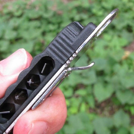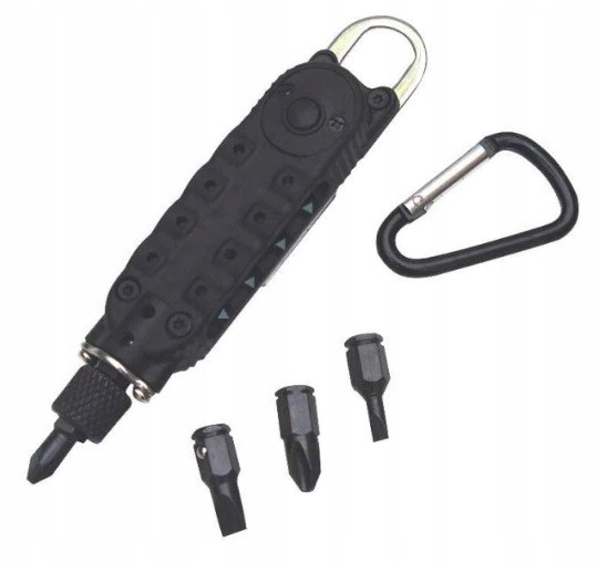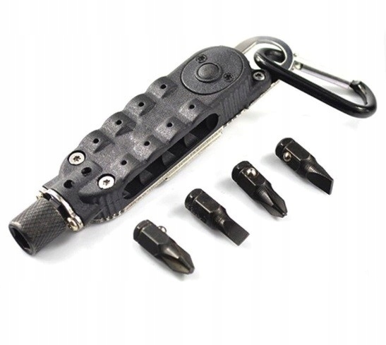 КАРМАННАЯ ОТВЕРТКА-ИНСТРУМЕНТ – компактный мультитул, оснащенный рядом необходимых функций. Основой является набор отверток-бит, смонтированных в сталькомпозитном корпусе. Мультитул имеет алюминиевый карабин, позволяющий прикрепить его, например, к брелоку, рюкзаку или сумке.