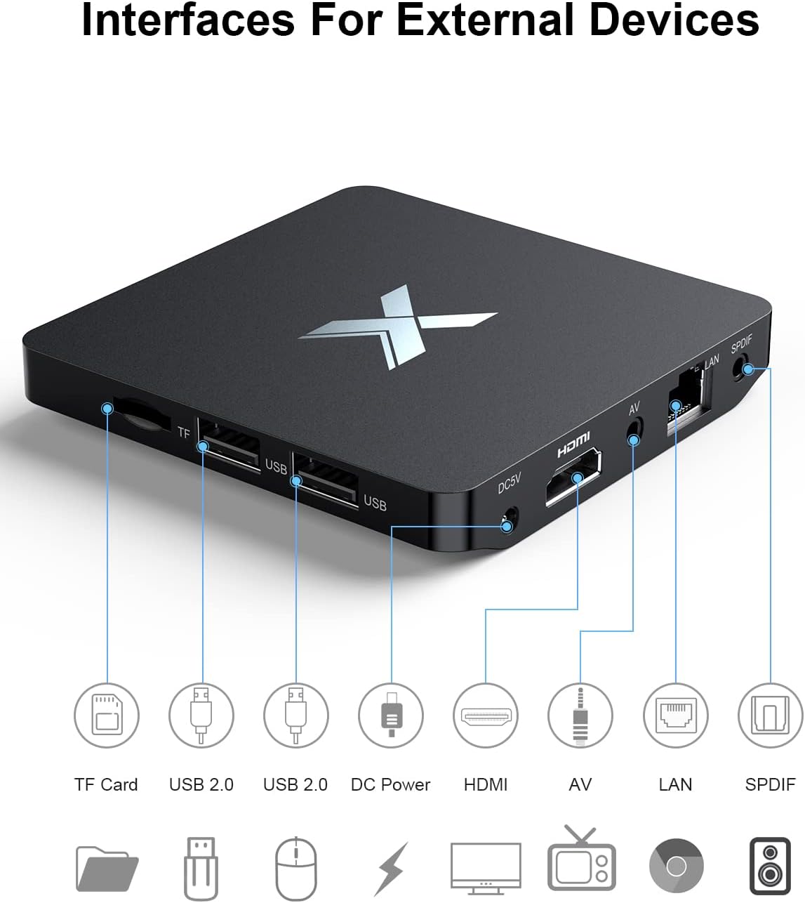 - Богатый интерфейс: Android Телевизор, потому что у него есть порт USB 2.0 x 2, порт HDMI x 1, порт TF-карты x 1, порт Ethernet 10/100M * 1, порт AV x 1, порт SPDF x 1, порт постоянного тока * 1, несколько портов для удобного подключения.