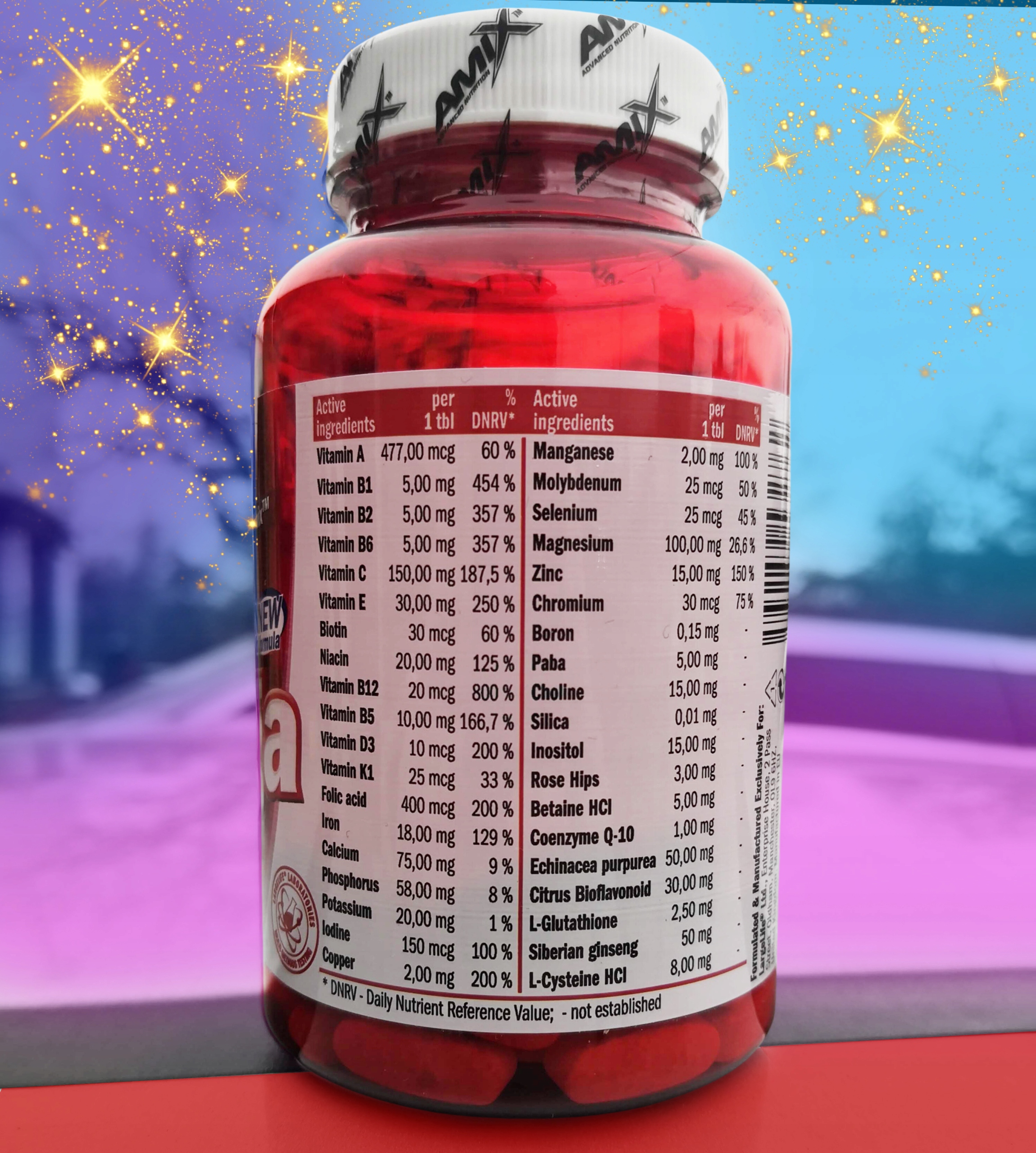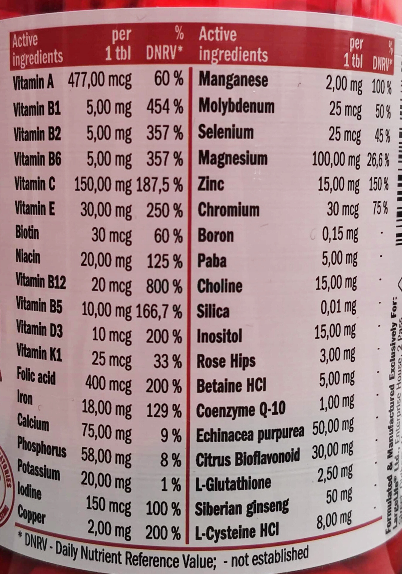 Состав: дикальцийфосфат, оксид магния, аскорбиновая кислота (витамин С), загустители: целлюлоза; dl-альфа ацетат (витамин Е), фумарат железа, эхинацея пурпурная, корень элеутерококка колючего (сибирский женьшень), стабилизатор: гидроксипропилметилцеллюлоза; Хлорид калия, битартрат холина, цитрусовый биофлоу-авоноид, глазирующий агент: стеариновая кислота, ниацинамид (ниацин), оксид цинка, инозитол, пантотенат кальция (витамин B5), антислеживатель: стеарат магния; L-цистеина гидрохлорид, сульфат меди, сульфат марганца, пиридоксина HCl (витамин B6), тиамина HCl (витамин B1), рибофлавин (витамин B2), PABA (парааминобензойная кислота), бетаин HCl, краситель: диоксид титана; Фолиевая кислота 10%, холекальциферол (витамин D3), биотин 1%, бета-каротин, порошок шиповника, селенит натрия 1%, восстановление L-глутатиона, цианокобаламин 1% (витамин B12), ретинилацетат (витамин А), коэнзим Q10, фитонадион. 5% (витамин К1), борная кислота, красители: Allura red AC, закатный желтый FCF; пеногаситель: ПЭГ, йодид калия, хлорид хрома, молибдат натрия, диоксид кремния.