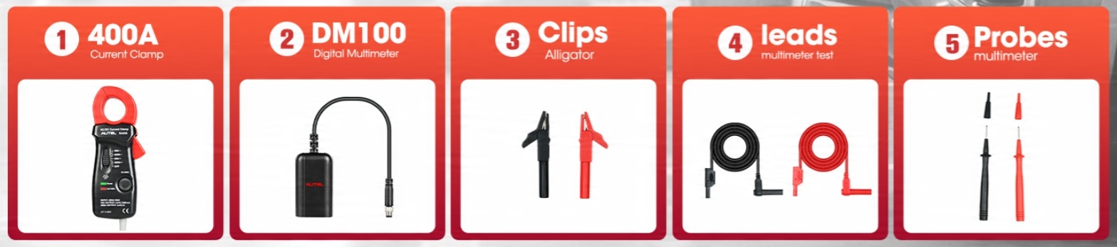 В комплект аксессуаров Autel Battery Tester (BTAK) входят электрический зажим, щупы и кабели цифрового мультиметра DM100 400А. При использовании с инструментами анализа аккумуляторов Autel MaxiBAS BT608 и BT609 BTAK позволяет техническим специалистам безопасно и легко устранять неисправности электрических систем и компонентов транспортных средств. В комплект входит электрический зажим Autel на 400 А с эффективным диапазоном измерения от 20 мА до 400 А переменного/постоянного тока.
