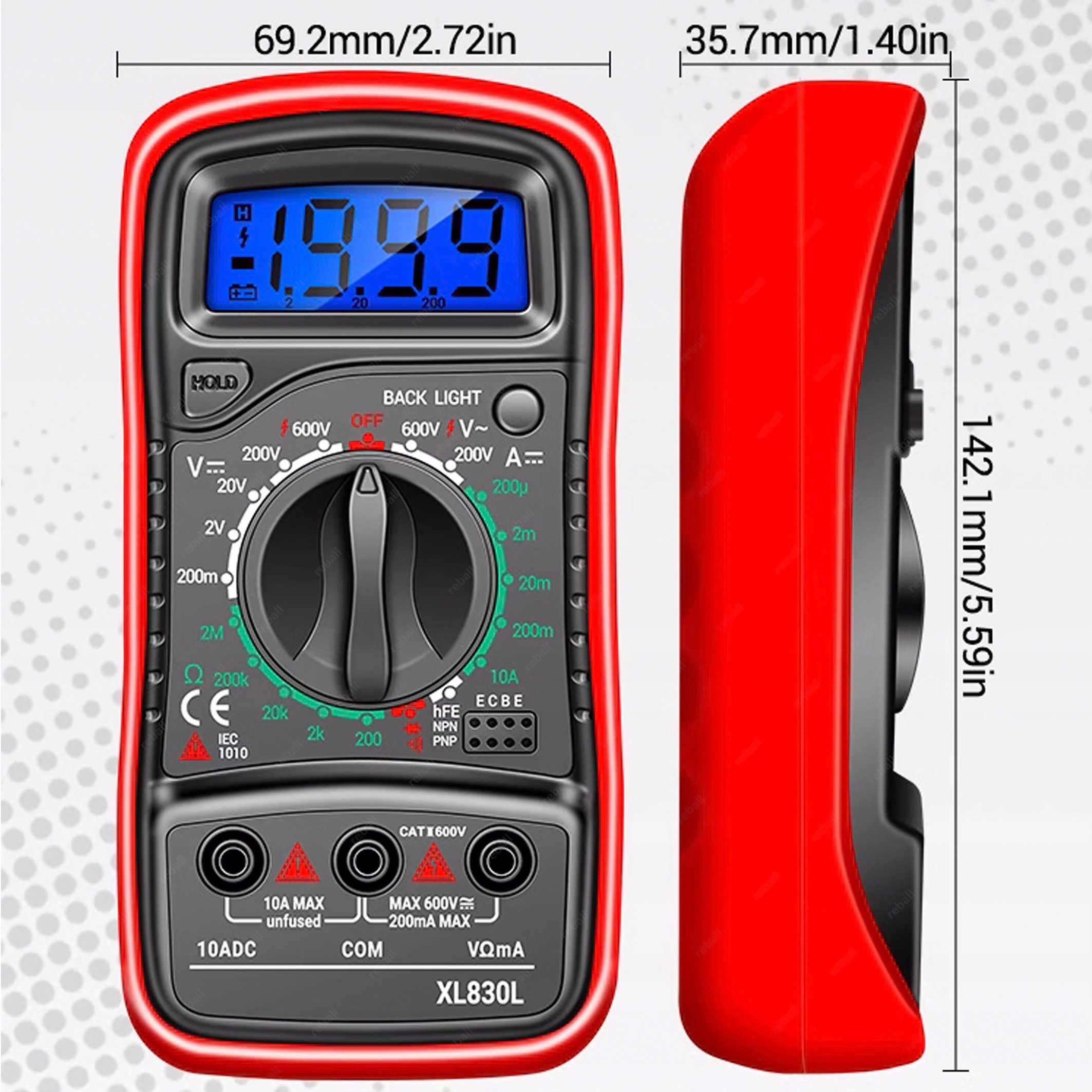 В дополнение к основным функциям измерения, предлагаемым цифровыми мультиметрами, таким как: измерение напряжения, тока, сопротивления, удержание индикации, он также имеет функции измерения коэффициента усиления (hFE) полупроводниковых биполярных транзисторов типа NPN и PNP, полупроводниковых диодов и звуковой сигнализации сопротивления менее 30 Ом (проверка на короткое замыкание, целостность соединения).
