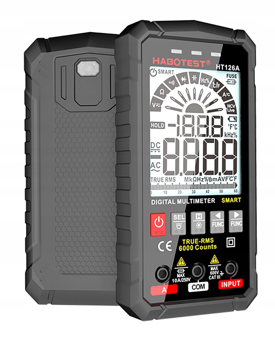 Цифровой универсальный мультиметр HT126A — это интеллектуальный и надежный мультиметр Habotest. Он отличается точностью измерений, его можно использовать и на открытом воздухе. Оснащен большим дисплеем и силиконовыми кнопками – пользоваться просто и удобно. Компактный и легкий — он также оснащен светодиодным фонариком, который позволяет работать в темных местах. Для питания необходимы 4 батарейки типа ААА 1,5 В. Однако они не входят в комплект и приобретаются отдельно. С его помощью можно измерять напряжение, сопротивление, емкость и т. д.