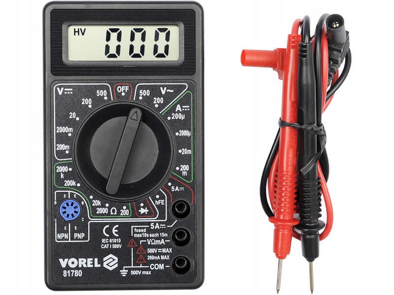 Электрические счетчики (мультиметры) позволяют измерять постоянное и переменное напряжение, а также переменный ток. Кроме того, универсальный электросчетчик Ворел 81780 позволяет измерять сопротивление и проверять диод. Измеритель имеет пластиковый корпус, жидкокристаллический дисплей и переключатель диапазонов измерения. На корпусе имеются измерительные гнезда и гнездо для проверки транзисторов. Счетчик оснащен измерительными проводами с вилками.