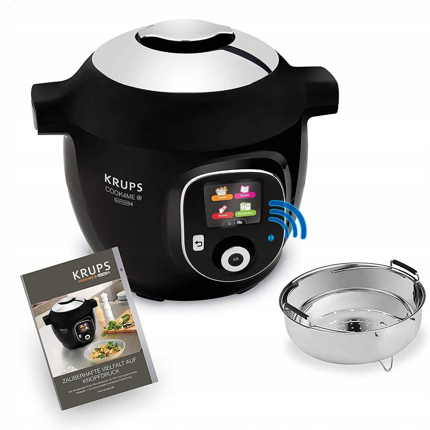 - Комплект поставки: Мультиварка Krups CZ7158 Cook4Me + Connect, съемный кабель питания, насадка для приготовления на пару, руководство пользователя