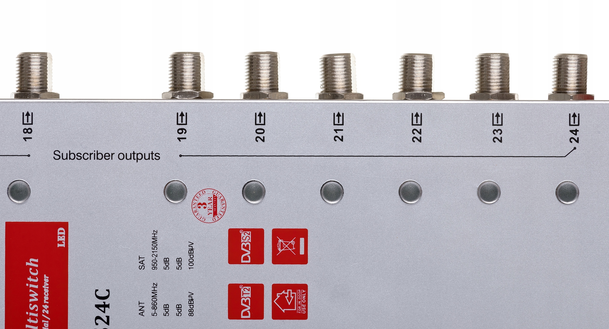 Мультисвич имеет 24 выхода с правой и левой стороны для подключения максимум 24 спутниковых или наземных тюнеров. Если ресивер имеет функцию записи, подключите к нему 2 кабеля от мультисвитча. Тогда мы сможем подключить до 12 таких приёмников.