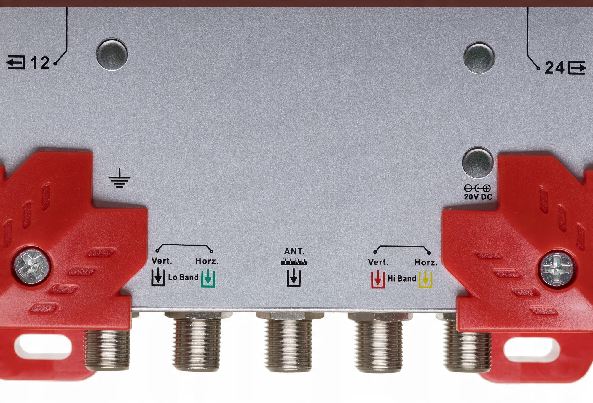 В верхней части мультисвитча расположены 5 входов для подключения сигнала с 1 спутника и с эфирной антенны. Четыре входа для подключения преобразователя quattro имеют маркировку Vert/Lo, Horz/Lo, Vert/Hi, Horz/Hi соответственно. их следует подключать к одинаковым маркированным выходам преобразователя. Средний вход с надписью ANT. используется для подключения сигнала от наземной антенны. Каскадная версия с 4 выходами SAT и 1 выходом DVB-T для подключения еще одного мультисвитча.