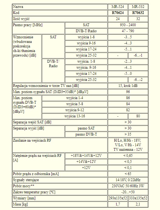 MR-524 имеет 5 входов и 24 выхода, что позволяет распределять сигналы от одного спутника, наземного телевидения DVB-T и аналогового/DAB-радио на 24 розетки. Если в установке будут использоваться двухголовочные ресиверы, для них следует выделить 2 мультисвичных выхода.