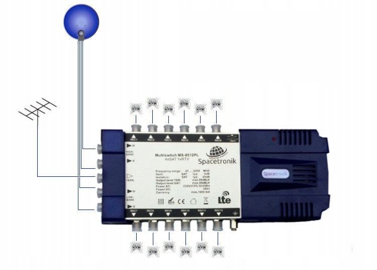 При производстве мультисвитчей Spacetronik мы решили не экономить. Поэтому мы использовали в устройстве стабильный блок питания для обеспечения длительной работы и дополнительный переключатель 0/12В для питания трека DVB-T/T2/FM/R (терминальные мультипереключатели). Мы использовали потенциометры высочайшего качества, которые обеспечивают очень хорошие рабочие параметры мультипереключателей, что полезно для стабильной и длительной работы, а также обеспечивает стабильный сигнал и быстрое переключение каналов в менее качественно выполненных установках, например. из-за плохой проводки, слишком маленькой спутниковой антенны, плохо установленной наземной антенны.