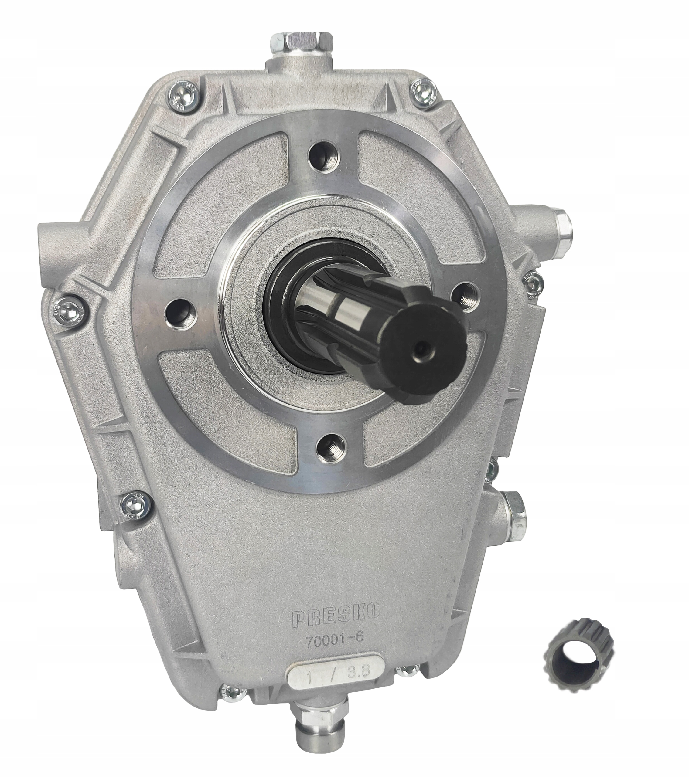 Мультипликатор с выступающим валом отбора мощности 1,3/8" DIN9611, так называемая "папа" шестерня. Редуктор поставляется с мультифрезерной зубчатой втулкой, позволяющей соединить мультипликатор с насосом. Изделие не заполнено маслом.