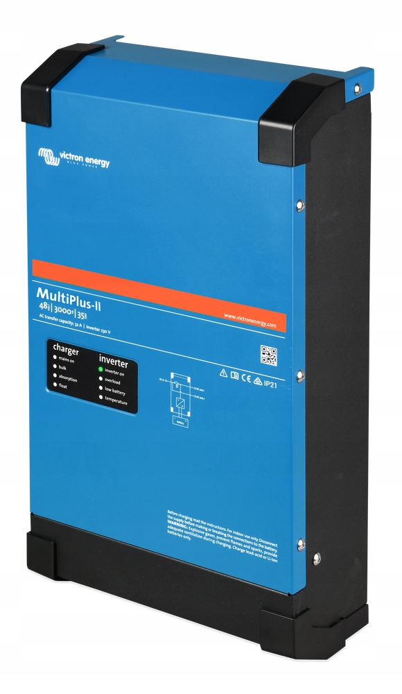 Эффективный синусоидальный инвертор MultiPlus-II 48/3000/35-32, современное зарядное устройство с технологией адаптивной зарядки и быстрым автоматическим резервным переключением.