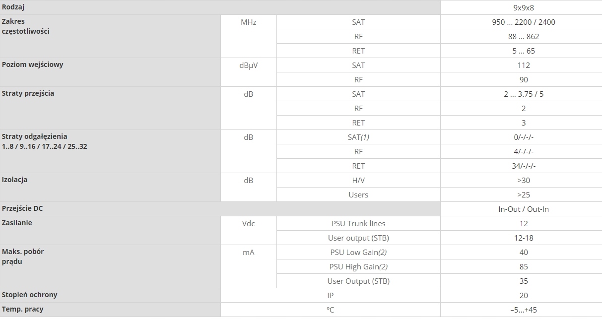 Устройства оснащены системой ECO, благодаря которой энергопотребление снижается по мере уменьшения количества подключенных пользователей. Корпус изготовлен из замака — благодаря этому достигается лучшее экранирование и отвод тепла. Телевизионные мультипереключатели бывают расширяемыми и каскадными (настройка через переключатель). Они характеризуются надежностью, высоким качеством изготовления и низким энергопотреблением.
