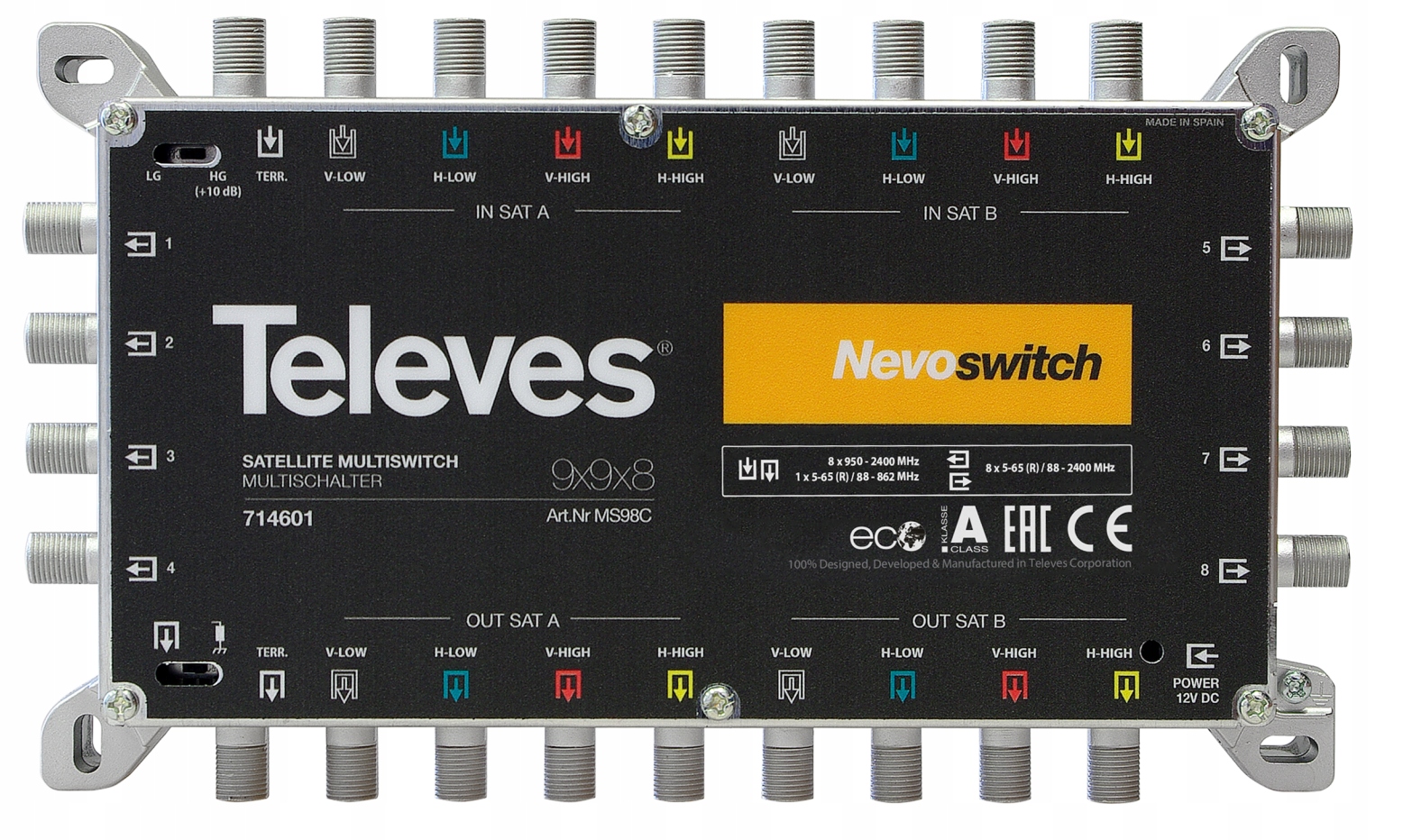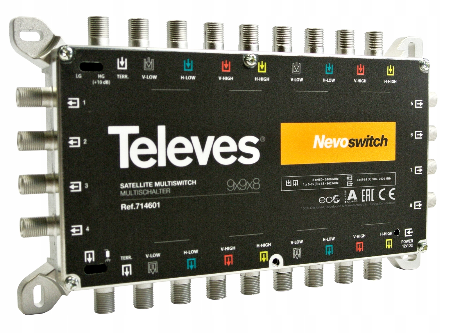 Телевизор Multiswitch Nevoswitch 9x9x8 с 8 спутниковыми входами для двух конверторов Quattro и 1 входом для эфирной ТВ-антенны (DVB-T) ) обеспечивает распределение сигнала на 8 абонентских розеток.