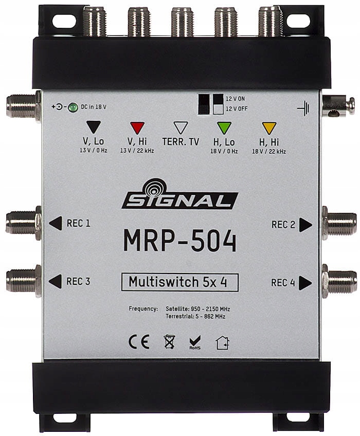 Multyswitch Signal Signal MRP-504-это устройство, которое позволяет объединять спутниковой и наземный телевизионный сигнал и передачу поставляемого сигнала до 4 очков (конечные гнезда). Multiswitch обладает способностью питать наземные телевизионные антенны. Устройство было оснащено переключателем, который позволяет переключаться или выключить 12 В.