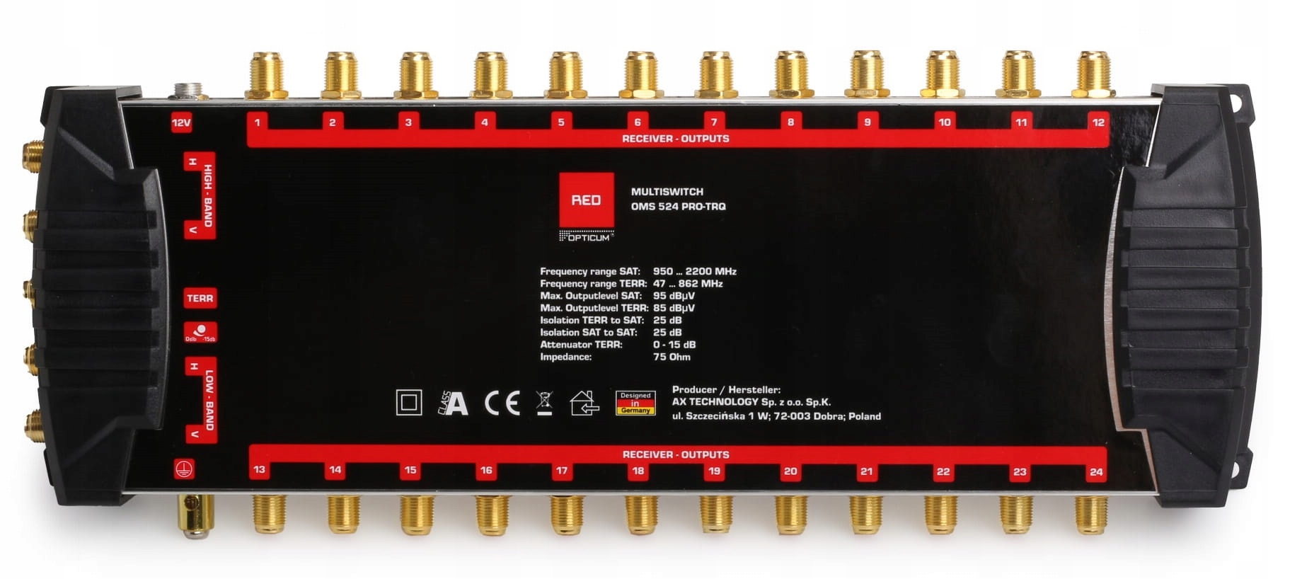 MultiSwitch 5/24 имеет комплект практичные ручки из высококачественного пластика, что позволяет устанавливать мультисвитч в различные типы телекоммуникационных щитов и коробок RTV (в нашем предложении доступны коробки для накладного и скрытого монтажа). В комплект с мультипереключателем входит блок питания.