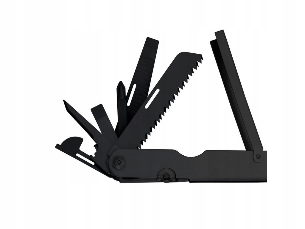 - Функции: консервный нож, комбинированные плоскогубцы, гладкое лезвие, маленькие прецизионная отвертка, мягкий кусачек, открывалка для бутылок, зубчатое лезвие, кусачки, крестовая отвертка, линейка, плоская отвертка, набор бит, напильник, шило, пила
