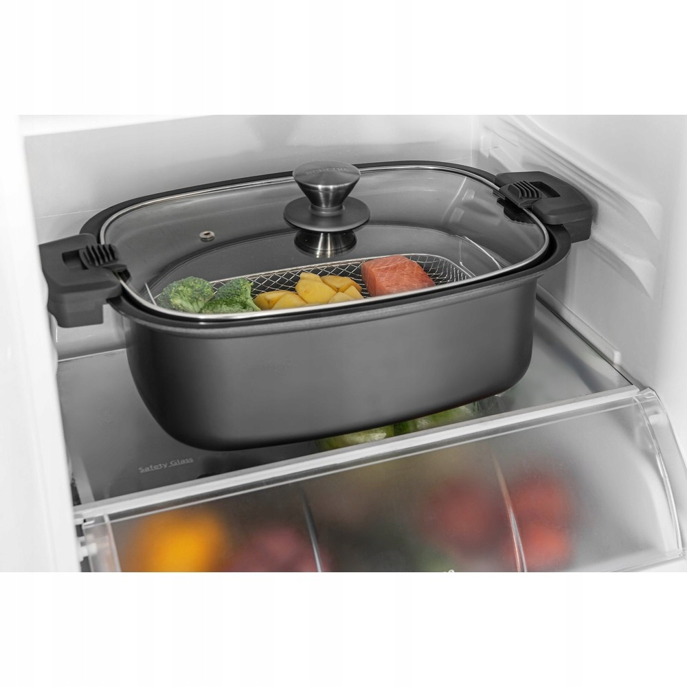 Большая пароварка из нержавеющей стали позволяет готовить рыбу, лапшу и овощи на пару.