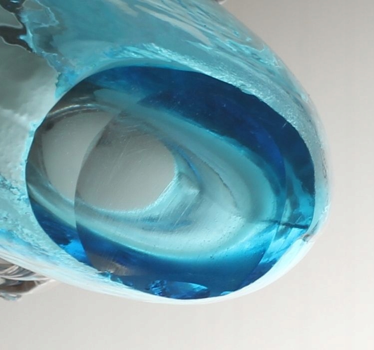 Интерьер без отложений. Стеклянные штампы без трещин и раздавливания. На одной из передних стен, возле основания, стеклянная масса имеет естественные складки. На краю основания, микропит, ок. 2 мм и два плоских осколка для ок. 5 мм и ок. 1см