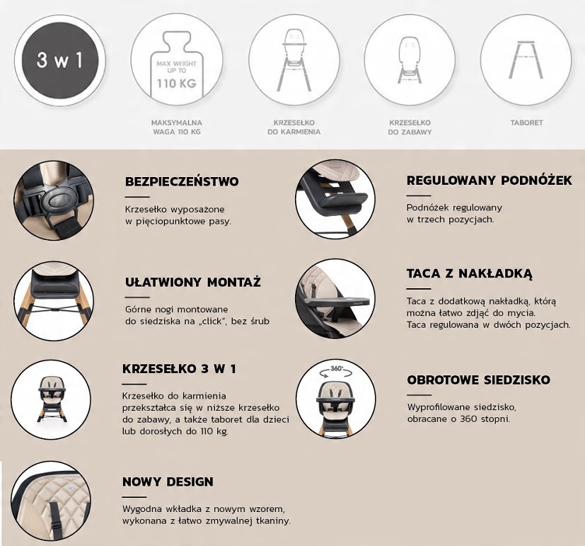 MUUVO CHOC 2 OBROTOWE KRZESEŁKO DO KARMIENIA 3w1 NA CAŁE ŻYCIE DO 110 KG