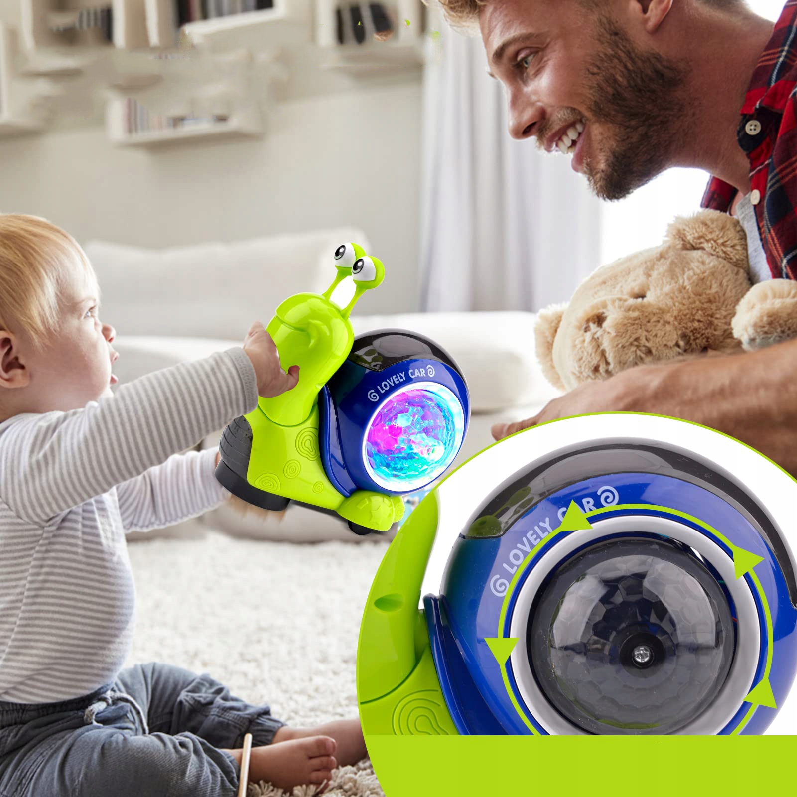 ⭐【Яркая музыка и красочные светодиодные фонари】: Благодаря встроенным светодиодным фонарям и музыкальному проигрывателю эта танцующая улитка светится разными цветами и воспроизводит оживленную музыкальную дорожку, которая способствует сенсорному развитию детей.