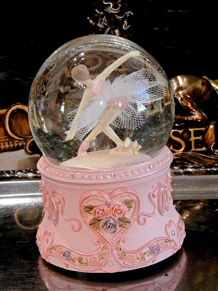 В ней красивая балерина, которая вертится при включении музыкальной шкатулки, а при встряхивании появляется "снег", прозрачные хлопья