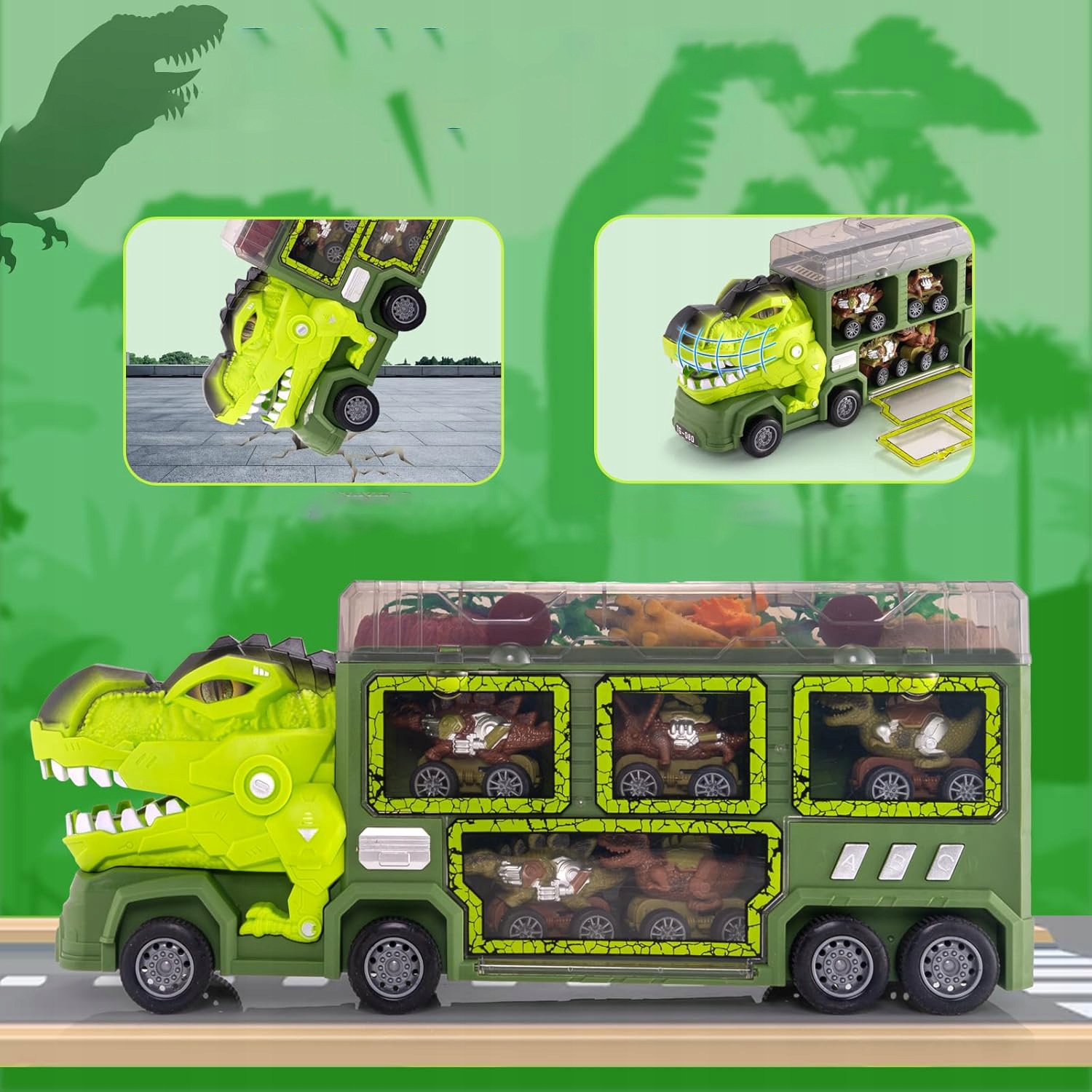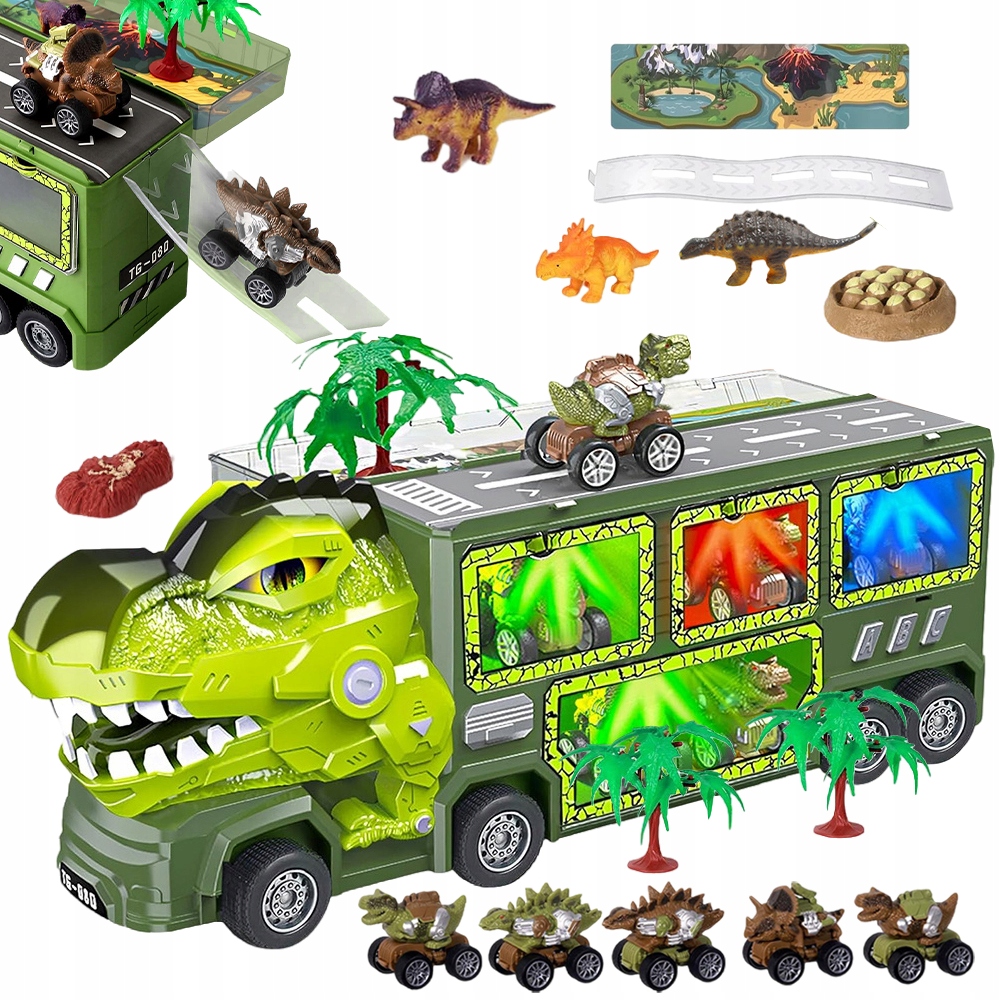 🏡 Грузовик динозавров, грузовик тираннозавра с 8 фигурками динозавров, транспортные автомобили, игровые коврики, яйца динозавров ›