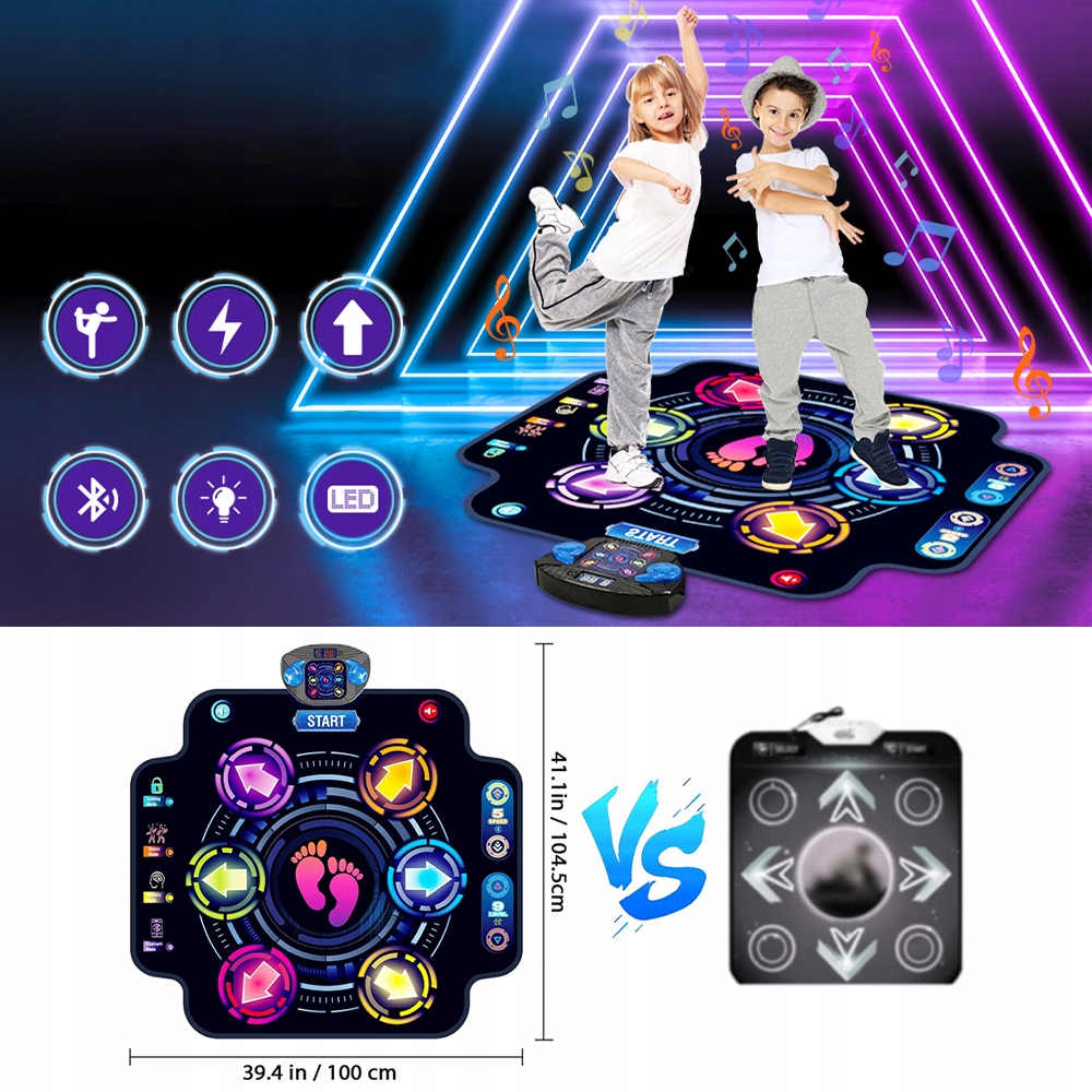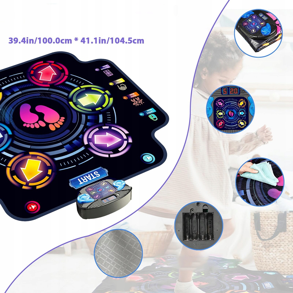 - Вы беспокоитесь, что ваш ребенок быстро перерастет танцевальный коврик? Не волнуйтесь, размер танцевального коврика составляет 39 х 41 дюйм, поэтому он очень большой и несравним с обычными ковриками.