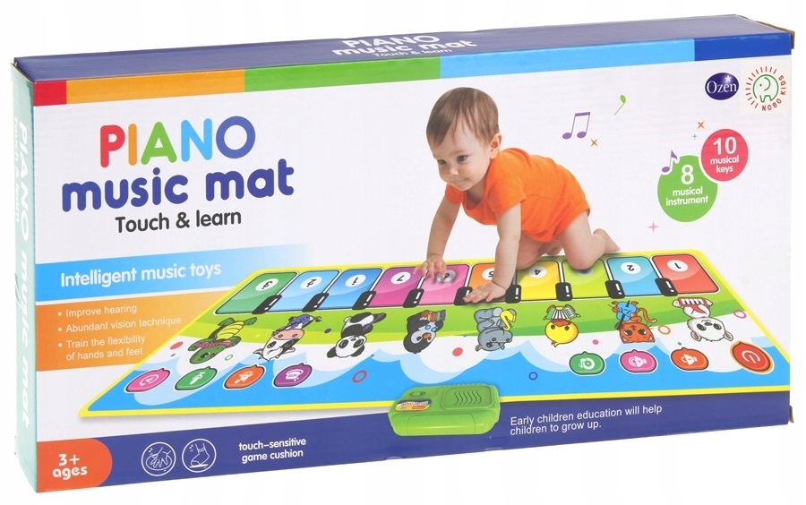 Это пианино вызывает желание играть и танцевать. После его включения вас встретит веселая мелодия. Все клавиши и значки на коврике активируются нажатием. Эта замечательная музыкальная и подвижная игрушка позволяет вам играть под сочиненные вами мелодии. Мы можем записать мелодию с помощью кнопки микрофона и многократно воспроизводить ее с помощью кнопки рядом с ней. Дополнительно игрушка имеет градуированную регулировку громкости, а записанная ранее мелодия исчезает из памяти при выключении игрушки. Вверху, посередине коврика, прикреплена зеленая коробочка с динамиком и дополнительной функцией включения и выключения. Благодаря интерактивному коврику ребенок имеет возможность познакомиться с основными звуками и ритмами, а разнообразие мелодий и возможностей музицирования может повлиять на развитие художественных навыков.