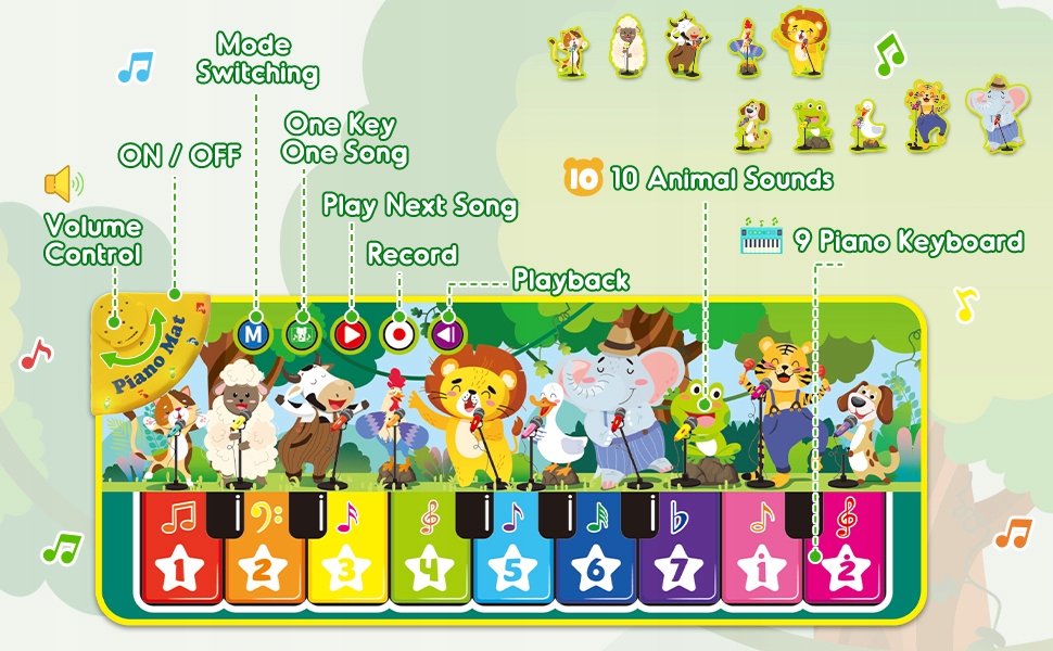Музыкальный коврик для фортепиано содержит 9 музыкальных ключей и 10 звуковых эффектов животных. Просто коснитесь любого функционального ключа фортепиано, чтобы погрузить ребенка в мелодичные мелодии. Этот красочный мат -мат не только помогает ребенку научиться распознавать цвета, но и знакомит их с различными музыкальными инструментами и животными и их звуками, а также стимулирует музыкальность и улучшает координацию рук и ног.