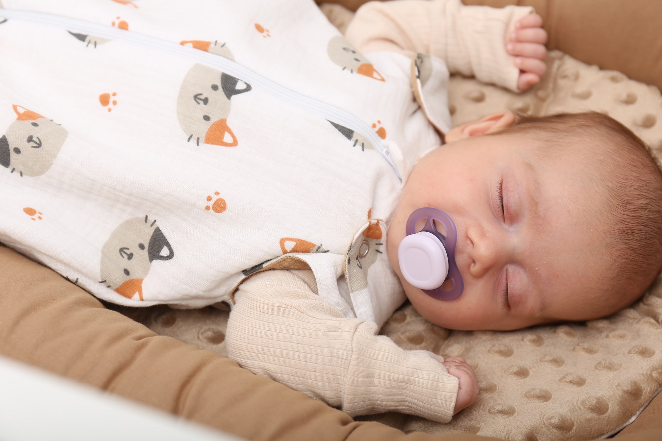 Мы сшили его деликатными muslin Double News . Форма спального мешка состоит из размер ребенка в верхней части, а расширил в ниже , чтобы обеспечить свободу маленьких. В положении на животе у ребенка много места для свободного расстояния бедер и ног.
