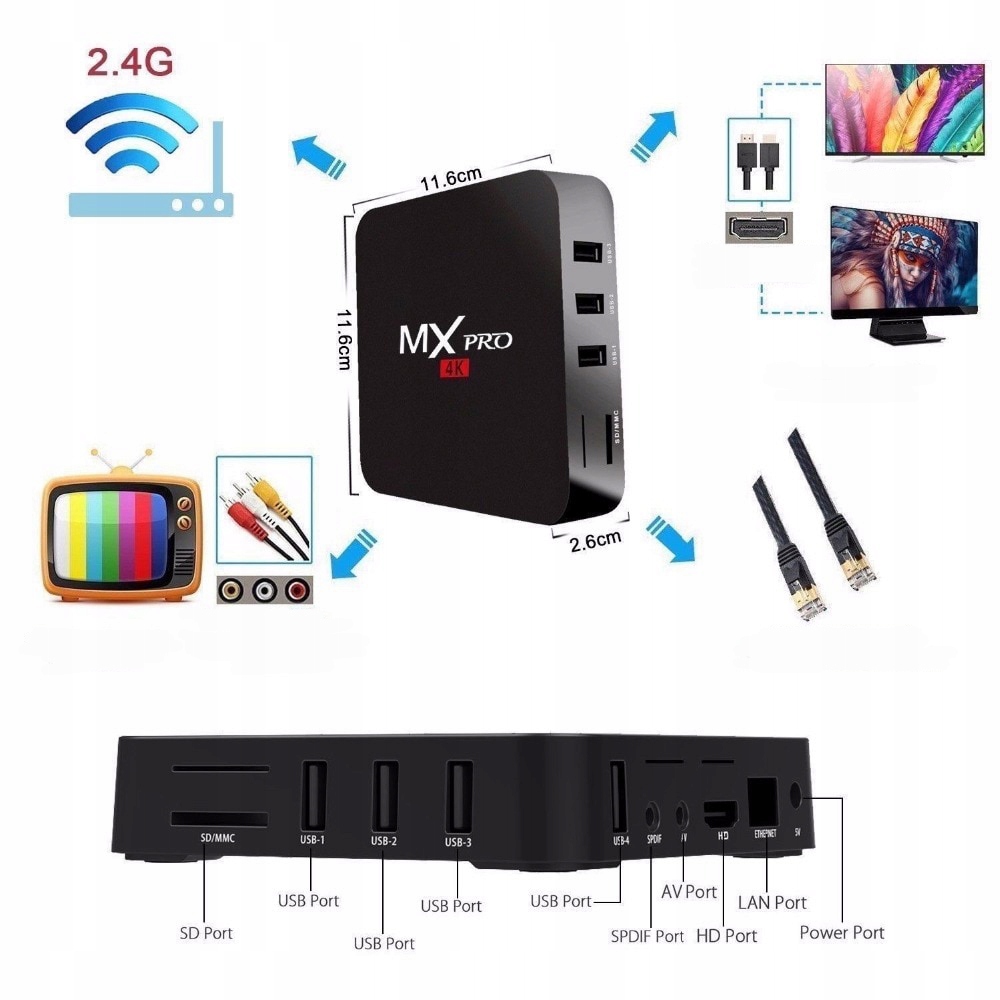 Это небольшое устройство превращает ваш телевизор в Smart TV — огромный мультимедийный развлекательный центр. Телеприставка TV BOX MXQ PRO позволяет пользователю использовать приложения социальных сетей, смотреть видео на YouTube, просматривать веб-сайты, слушать музыку, воспроизводить материалы, сохраненные на карте SD или MMC, получать доступ к онлайн-телевидению или использовать такие приложения, как: Ipla, VOD, Facebook, HBO GO, Netflix, TVN Player и другие. Открывает доступ к более чем миллиону приложений, игр, книг и многому другому из Google Play. Все это с вашего телевизора.