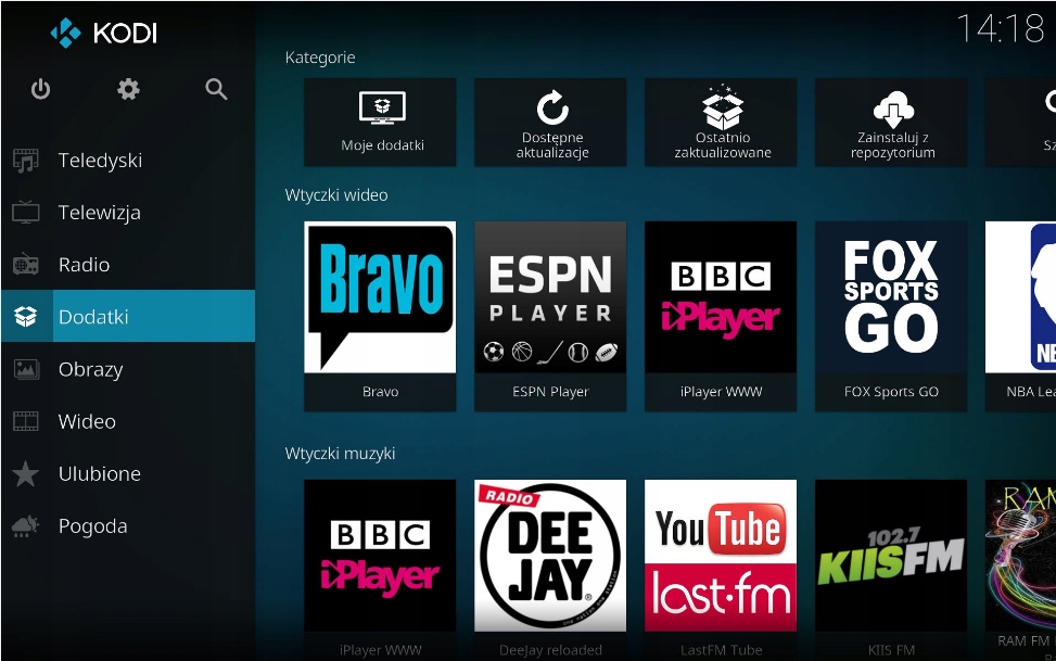 Последняя версия программного обеспечения KODI с меню на польском языке.