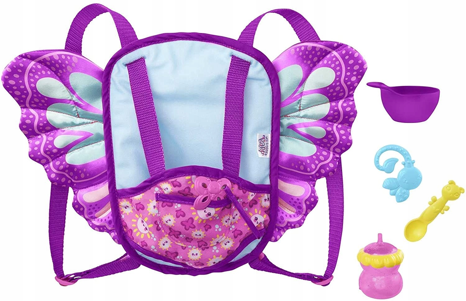 С помощью этой переноски-бабочки дети смогут брать с собой кукол My Garden Baby куда захотят. Переноска также служит рюкзаком и оснащена бутылочкой, прорезывателем, соской, чашкой и ложкой. Ребенок может носить переноску спереди или сзади, а благодаря регулируемым ремням ее легко отрегулировать.