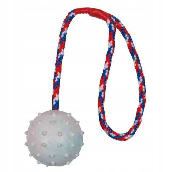 Резиновый мячик на веревке для собак. Идеально подходит в качестве прорезывателя или для игры в апорт и перетягивание каната. Веревка с петлей предотвращает случайные укусы. Игрушка изготовлена из натуральных материалов, безопасных для зубов и десен питомцев. Веревка также облегчает бросок и ловлю мяча. Идеально подходит для обучения и игр со щенком.