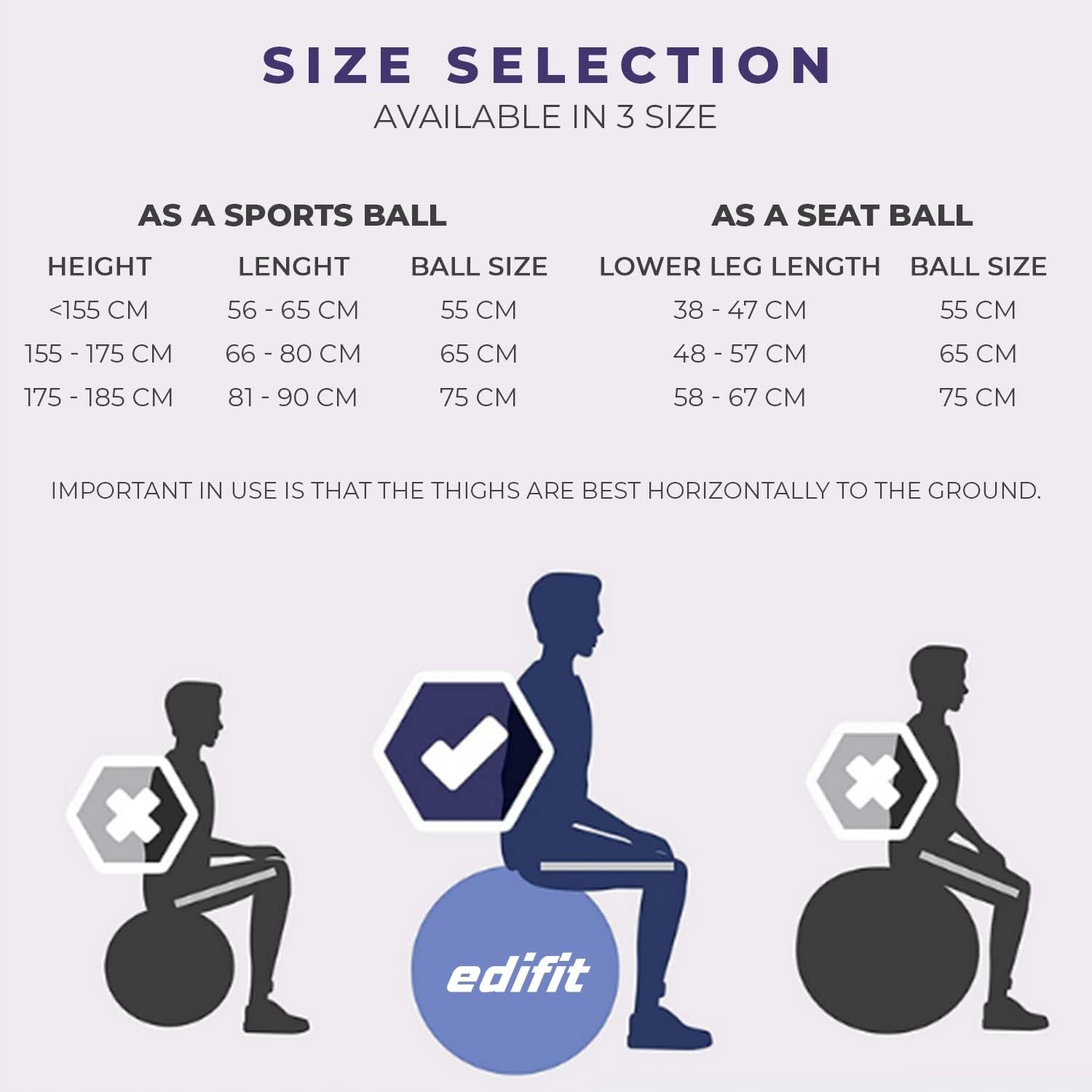 Несколько размеров: наш мяч Edifit доступен в трех размерах (55, 65, 75) см, поэтому его можно адаптировать к любому человеку и любым потребностям, а также предлагает широкий спектр альтернатив.