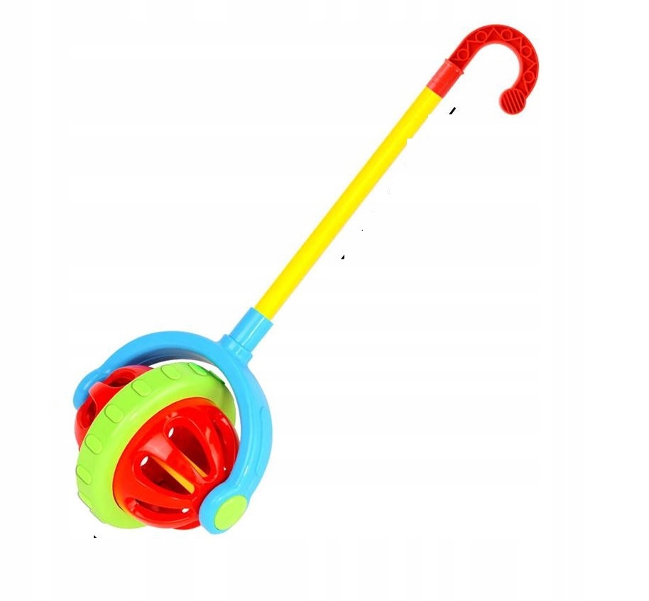 Толкатель оснащен вращающимся шариком. Внутри шарика с дырочками находится еще один маленький шарик, который издает щелкающий звук, когда малыш двигает толкатель вперед. Игрушка оснащена удобной ручкой. Изделие достаточно широкое, чтобы обеспечить устойчивость ребенка во время использования. Интересные цвета привлекают его внимание.