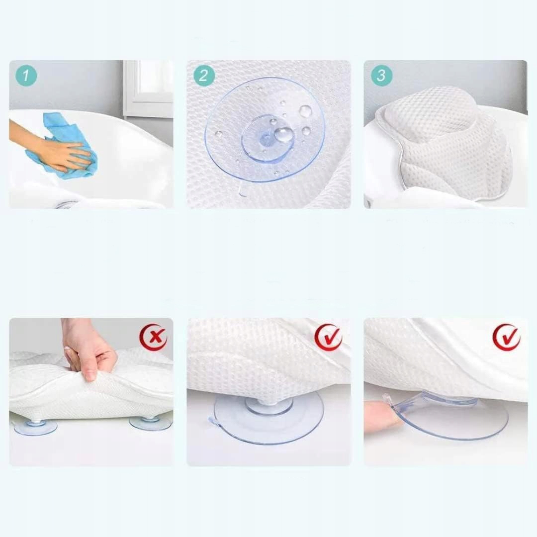 🛁🛁 【6 ПРИСОСОК】 — 6 больших вшитых присосок чашки можно использовать, чтобы прикрепить подушку к поверхности ванны и гарантировать, что подушка не соскользнет. Наша подушка для ванны легко прикрепляется к ванне и остается на месте во время купания, когда вы используете ее в качестве спинки и подголовника.