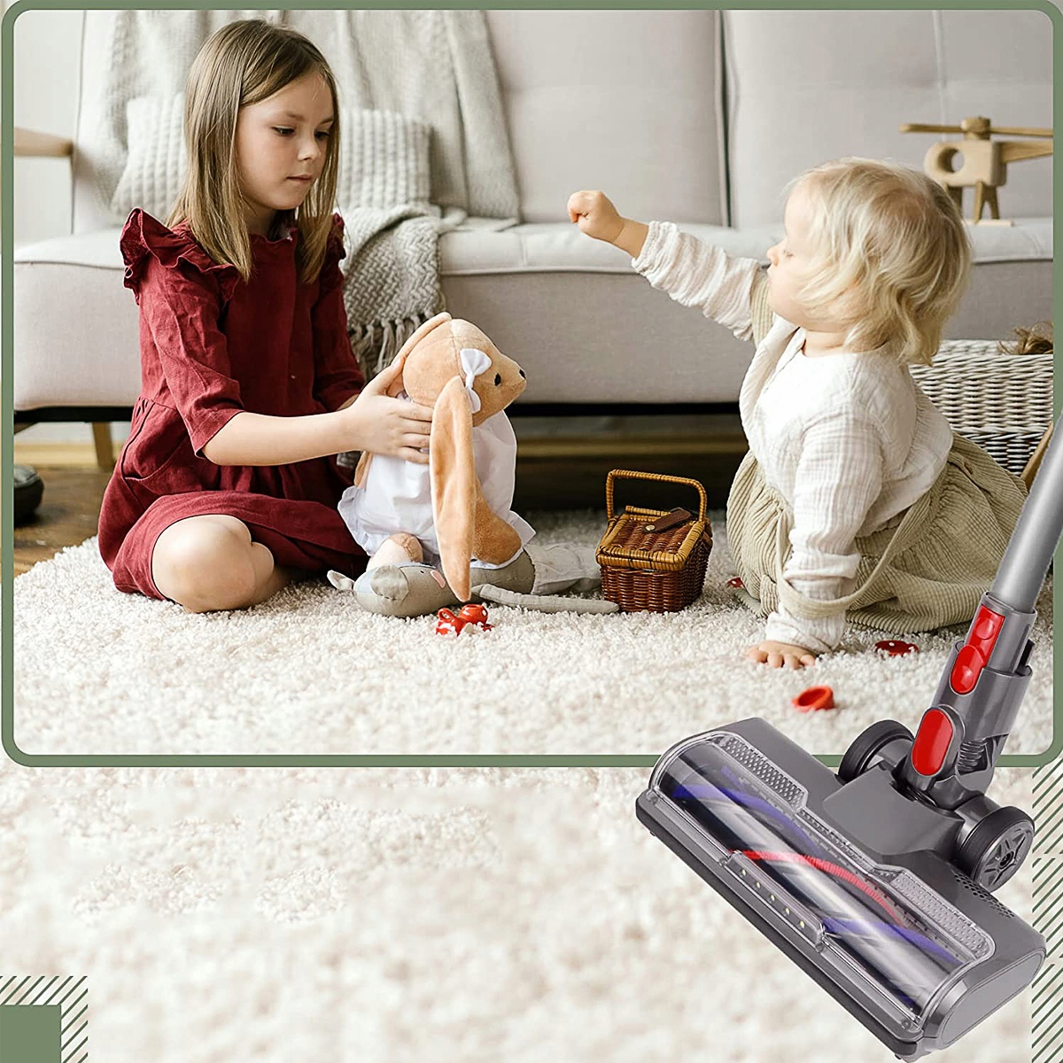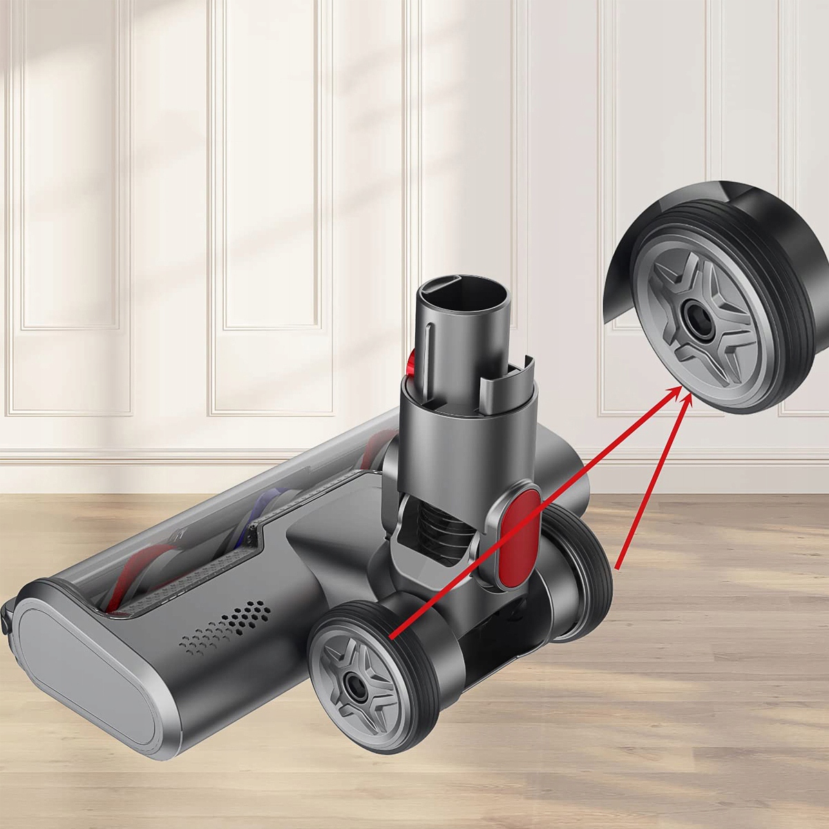 Спереди имеются 2 маленьких колеса, сзади 2 больших колеса с уникальным силиконовым бампером. Эта моторная головка подходит для многих типов полов, таких как ковры, мрамор и гладкая плитка. ПРИМЕЧАНИЕ. Не подходит для чистки короткой шерсти домашних животных на коврах.