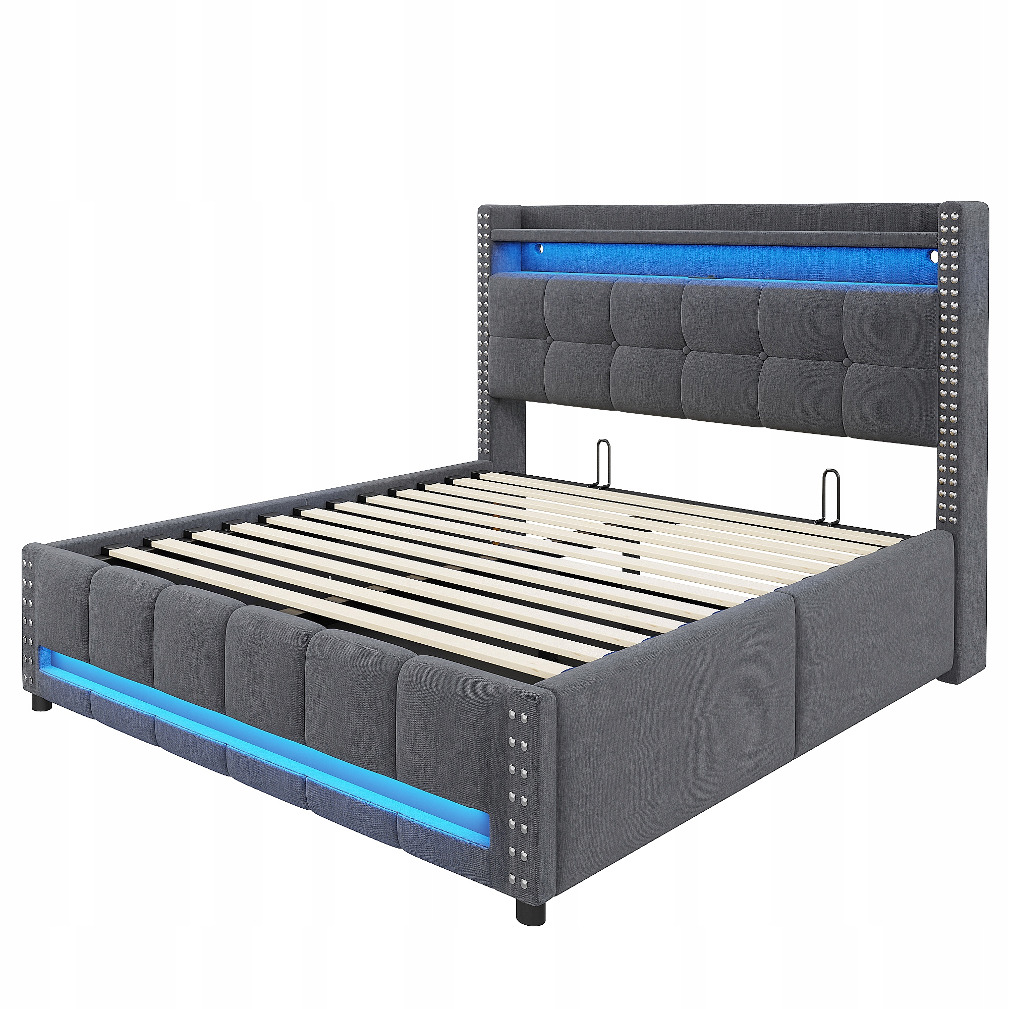 Обитая кровать 140*200 см со светодиодным освещением и гнездо USB, изголовье с полками и пространством для хранения, с гидравлическим хранением, двуспальная кровать для взрослых, серая льняная ткань